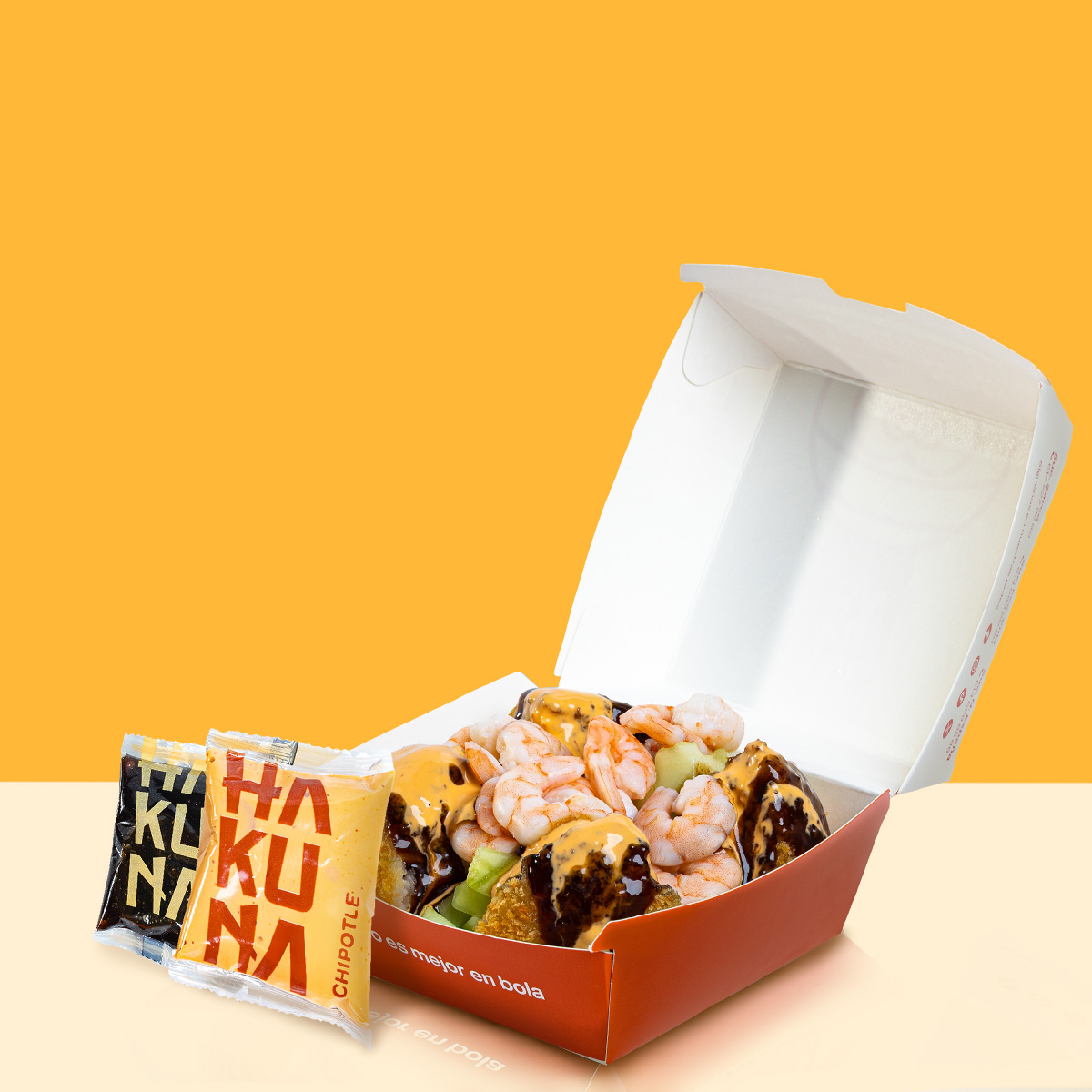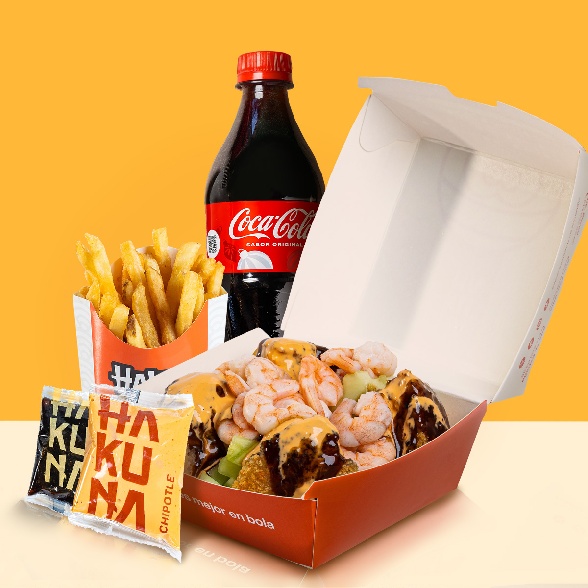 Bola de arroz con camarón + papas + refresco 600 ml.