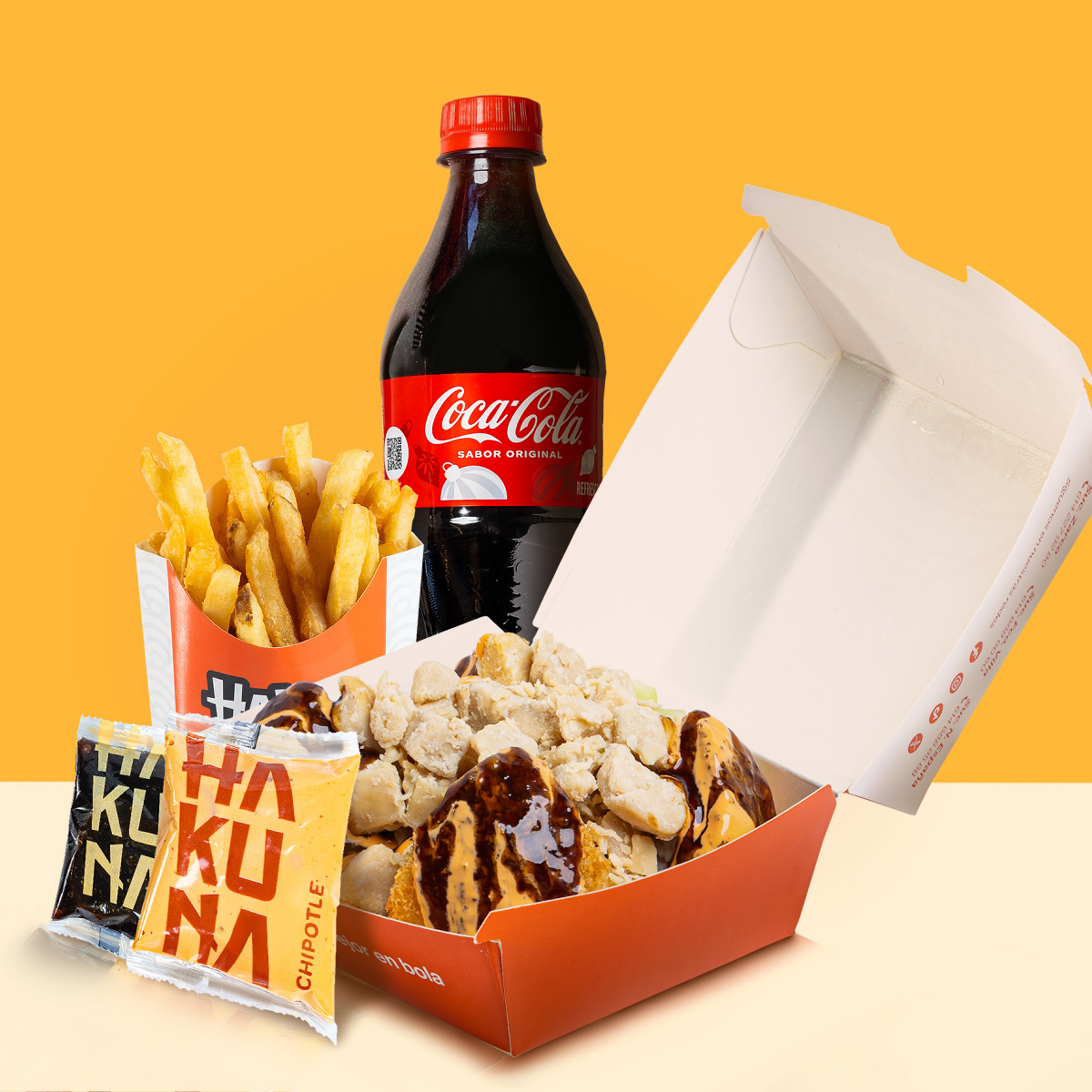 Bola de arroz con pollo + papas a la francesa + refresco 600 ml.