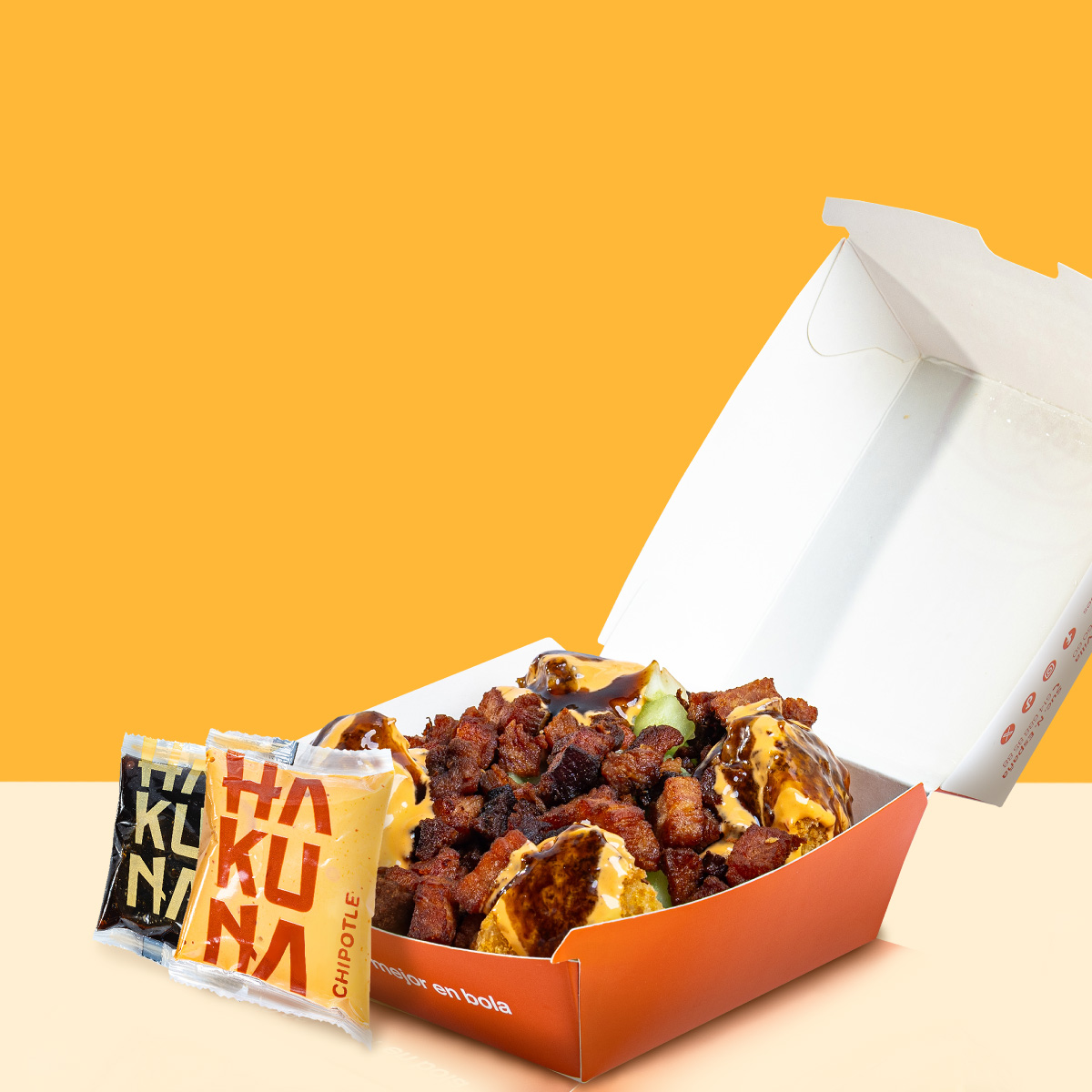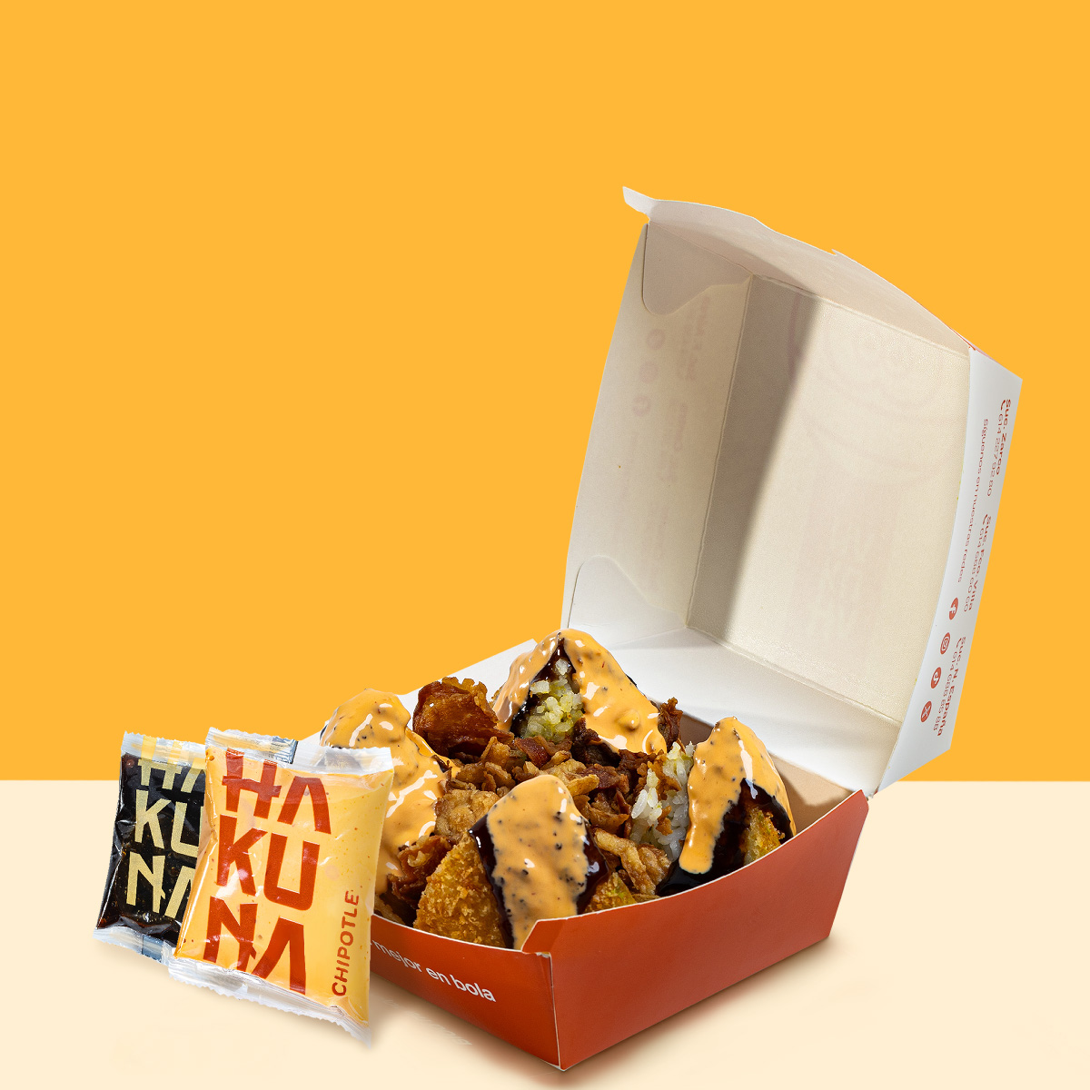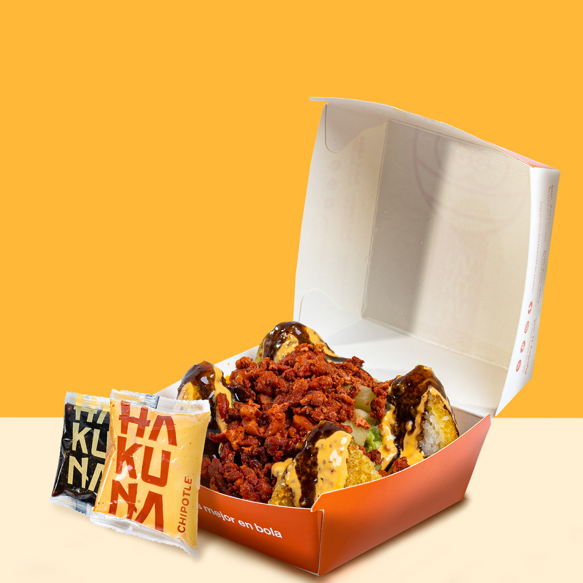 Bola de arroz con tocino + papas a la francesa + refresco 600 ml.