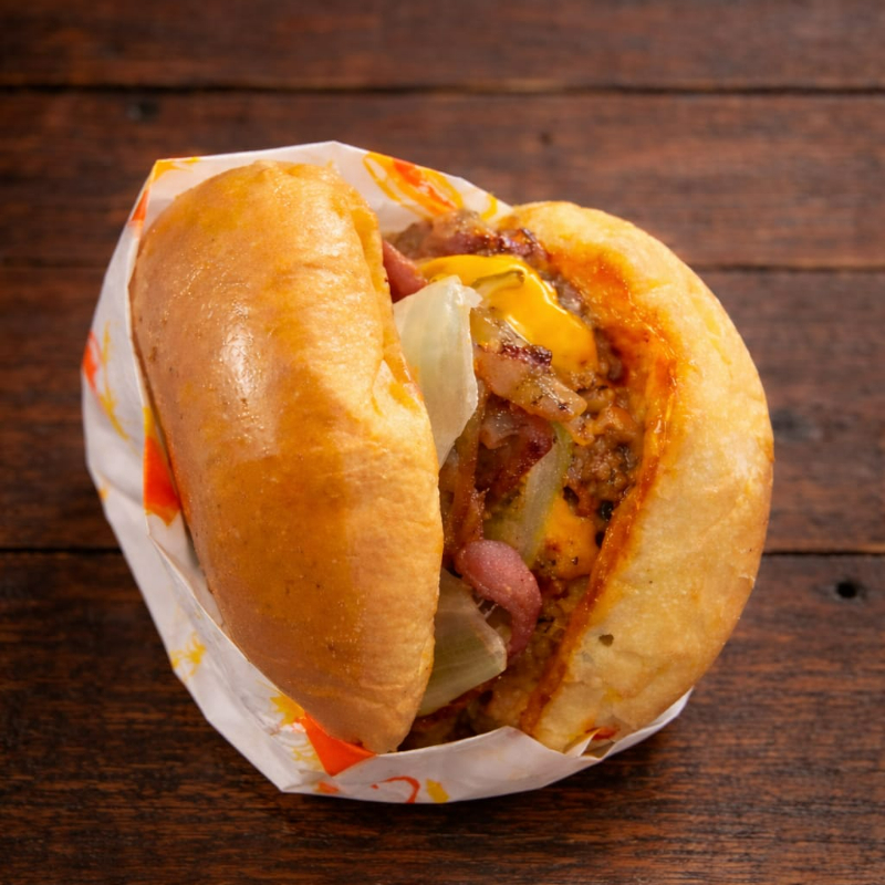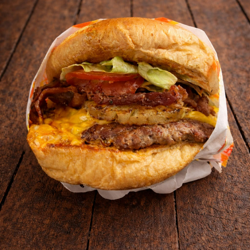 Carne, Queso americano, Piña, Tocino, Lechuga, Tomate, Cebolla caramelizada, Pan brioche, Aderezo de la casa