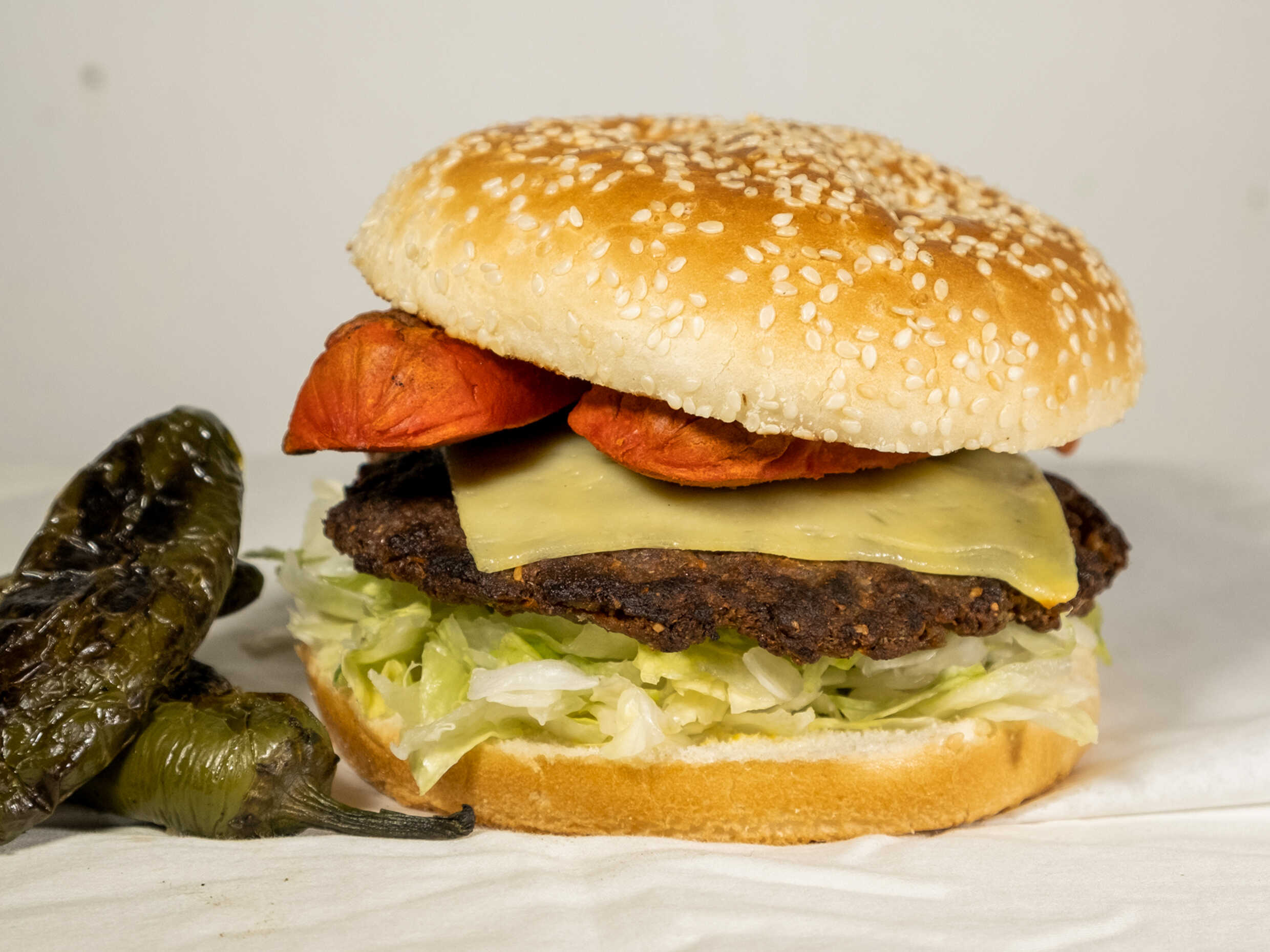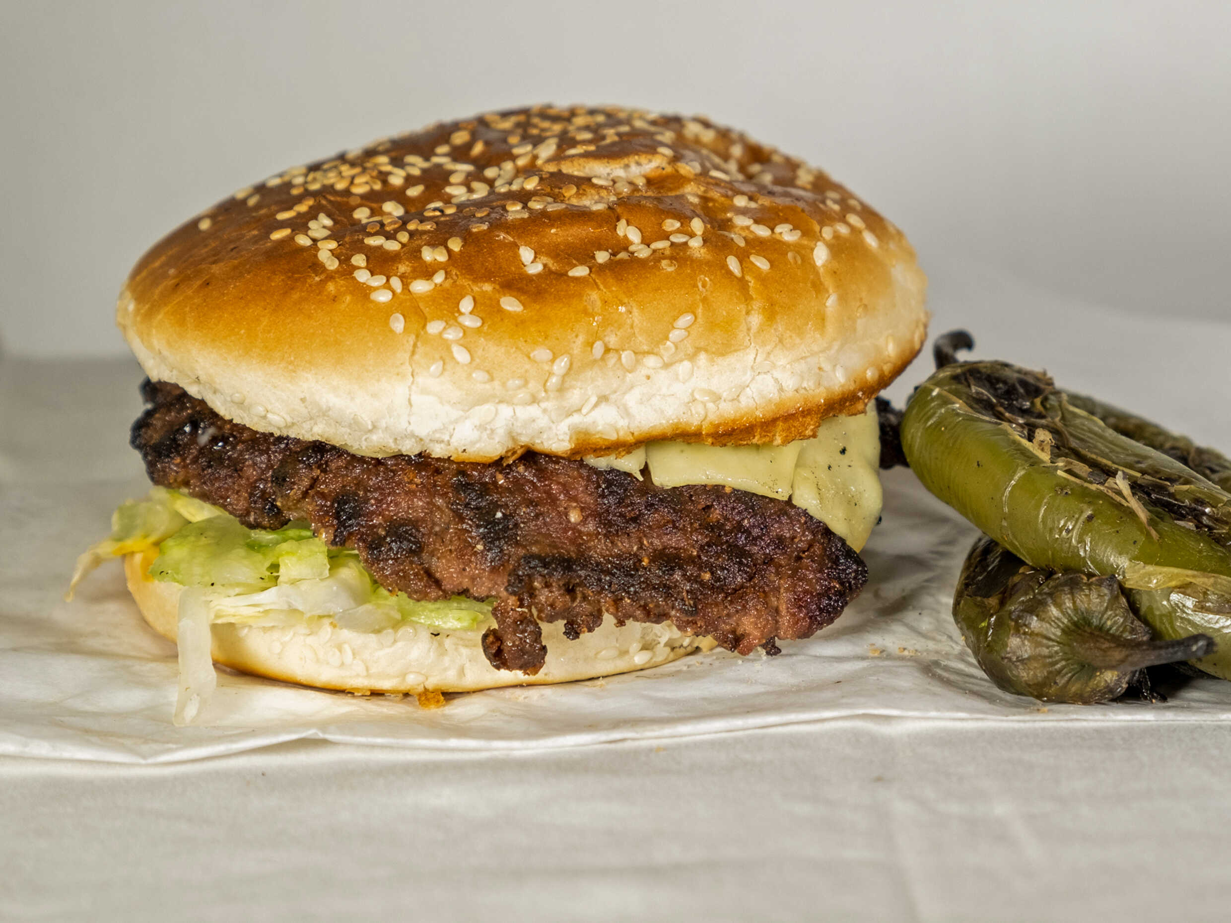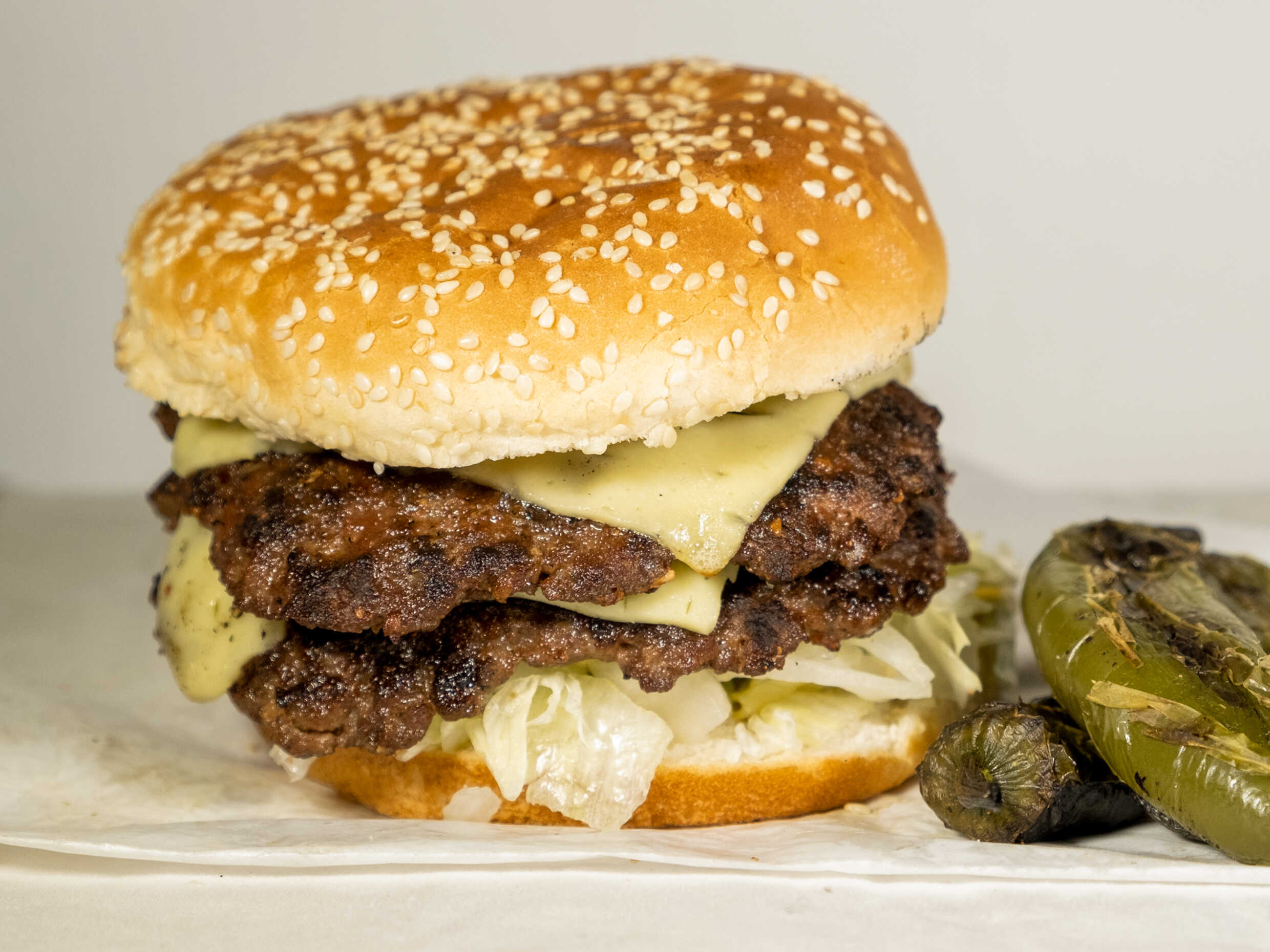 Doble carne, queso, verdura y aderezos.