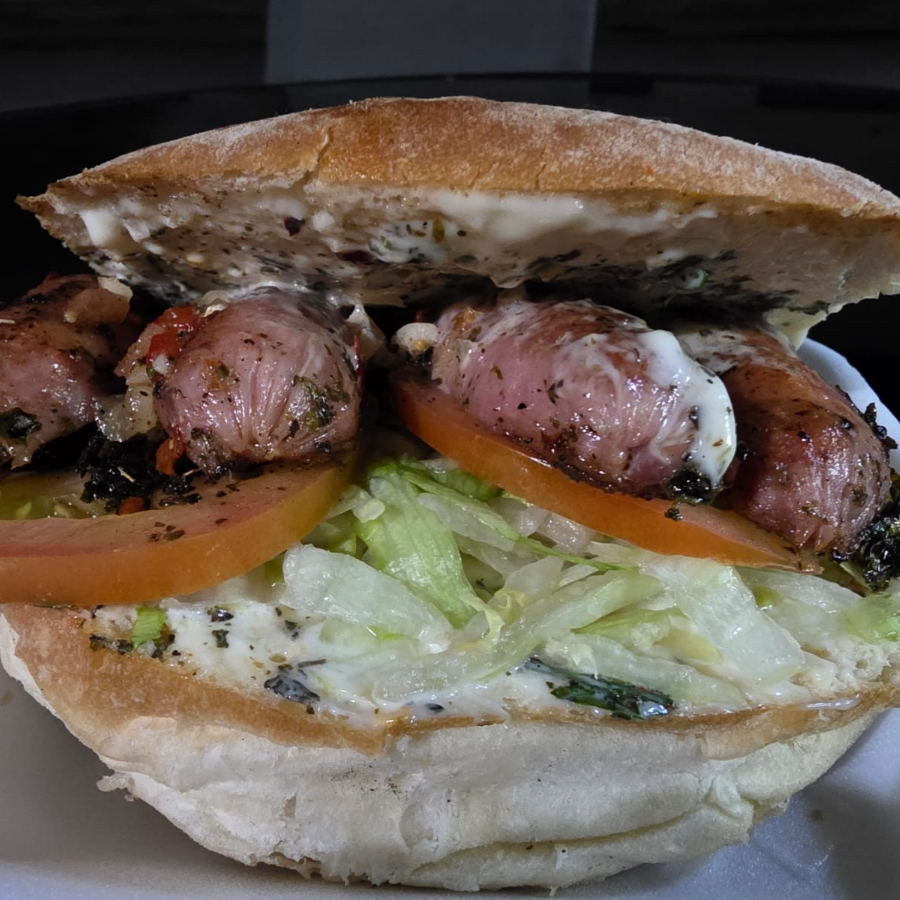 100 grs. Chorizo Argentino con Chimichurrí, Lechuga, Tomate, Salsa Criolla y Mayonesa