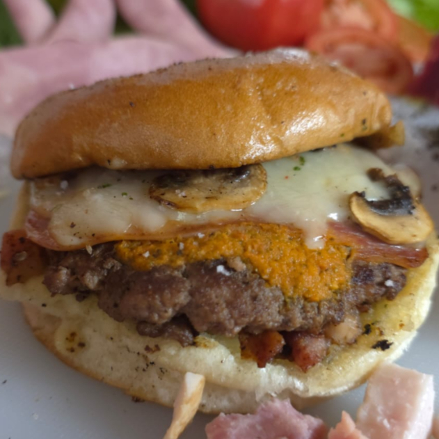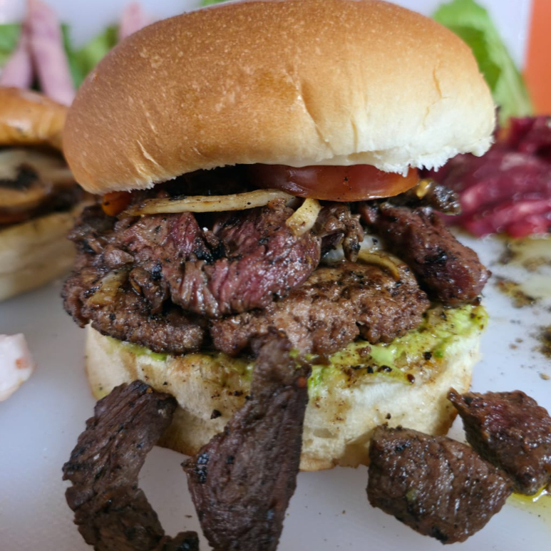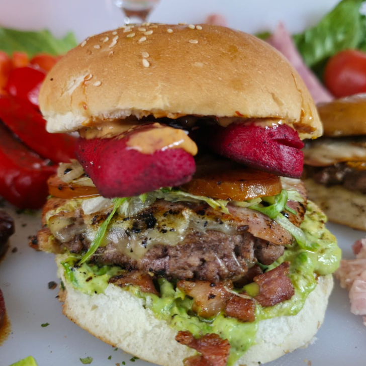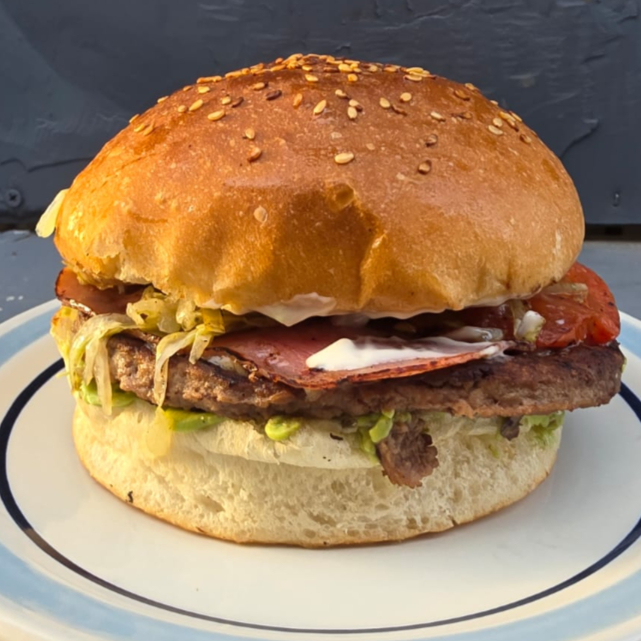 Arrachera, Tocino, Carne de Hamburguesa, Lechuga, Tomate, Cebolla Caramelizada, Aguacate y Mayonesa