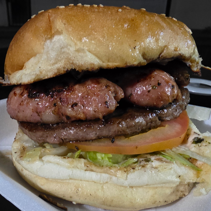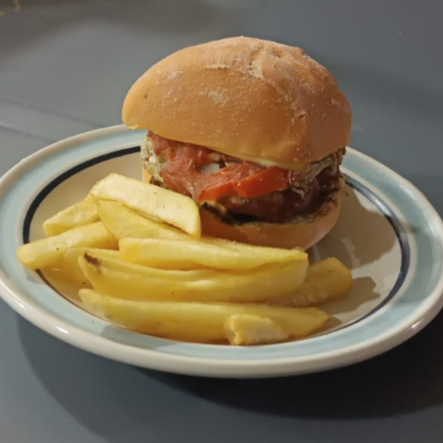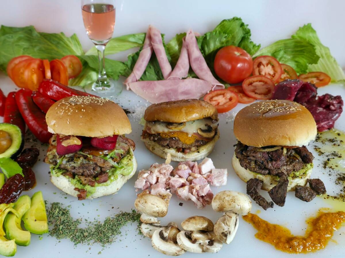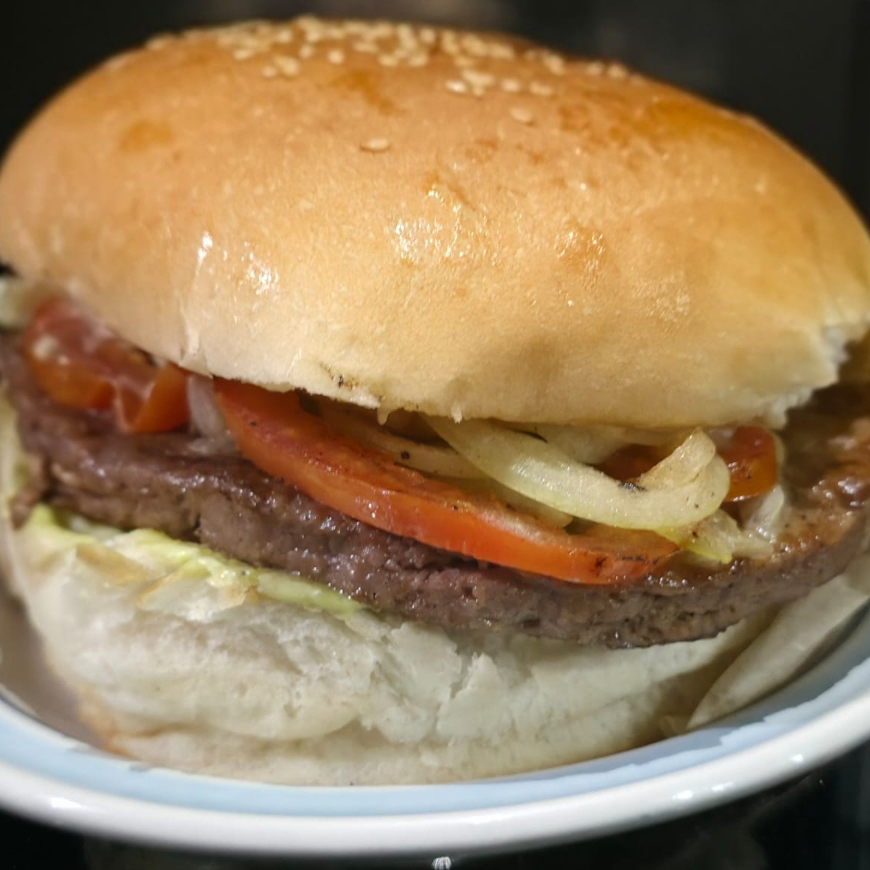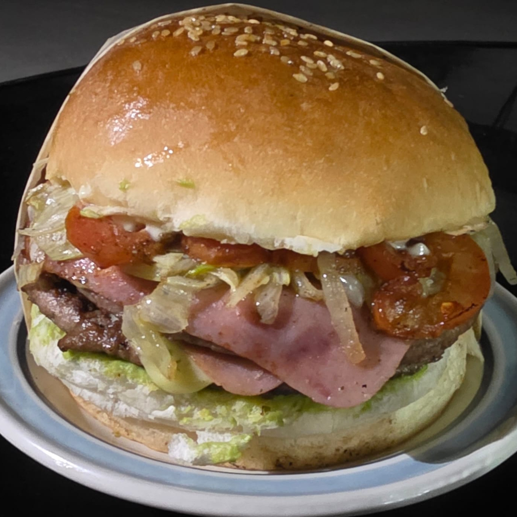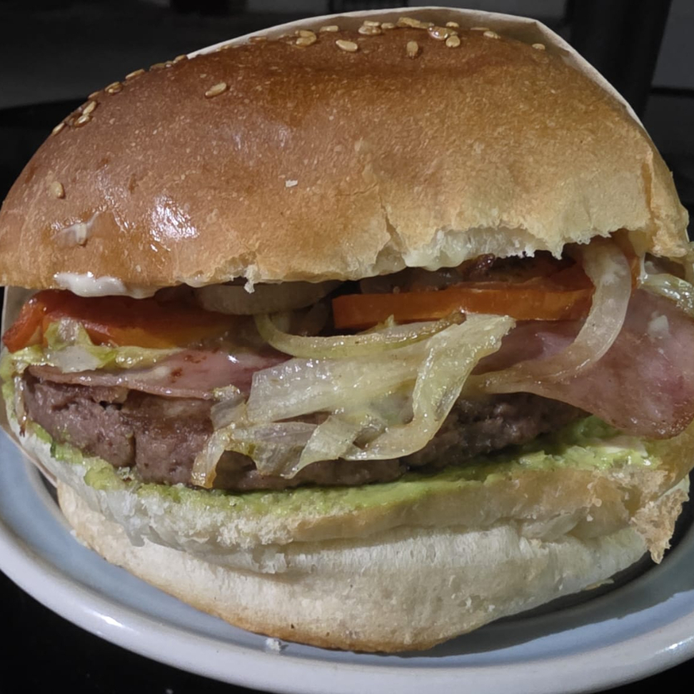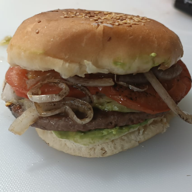 Carne, Lechuga, Tomate, Cebolla Caramelizada, Aguacate y Mayonesa