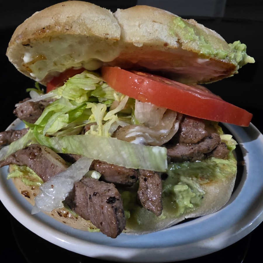 100 gr. de arrachera, Lechuga, Tomate, Cebolla Caramelizada, Aguacate y Mayonesa