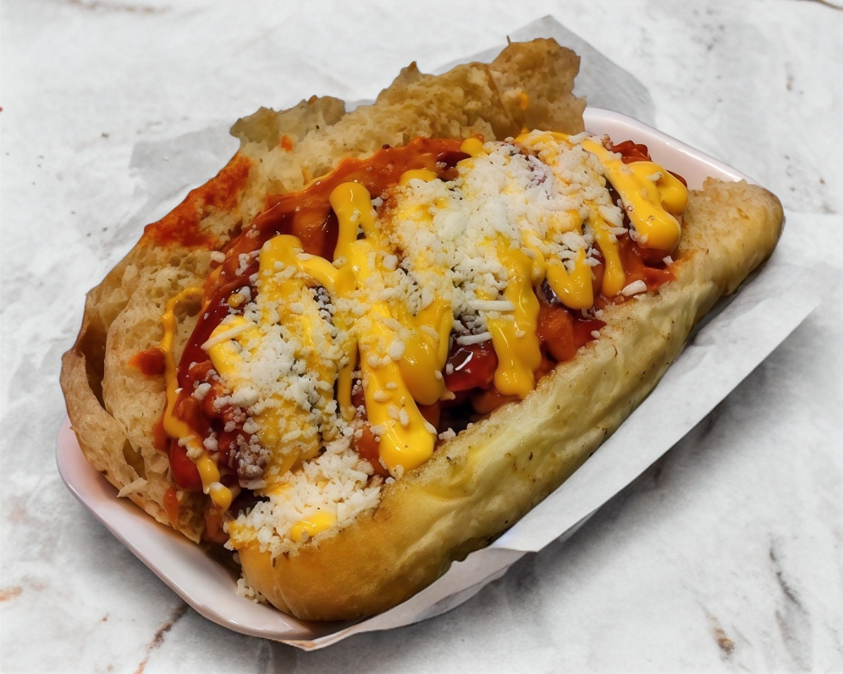 Hot dog con salchicha campestre, tocino, chili beans y aderezo.