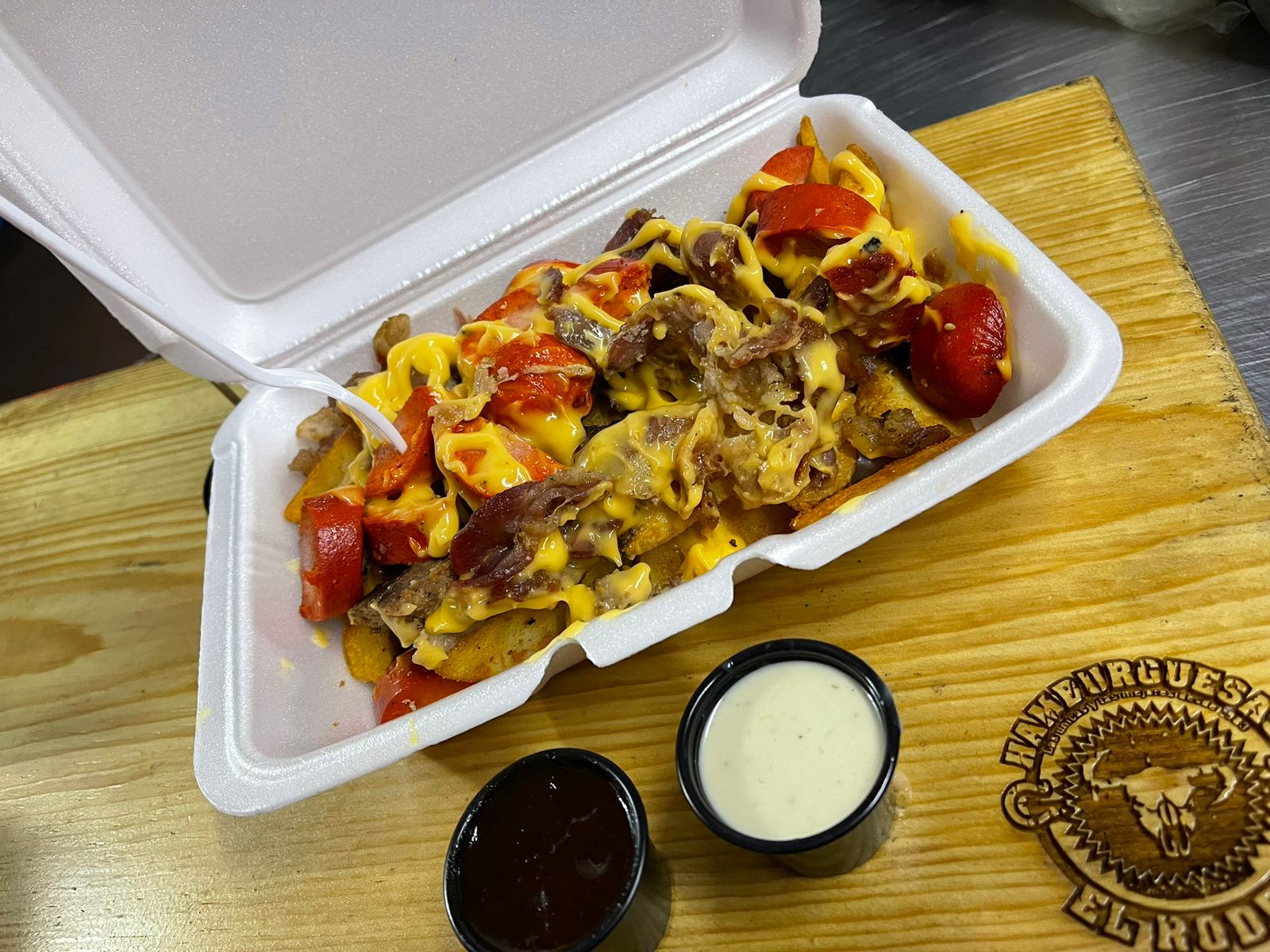 Papas en gajo, Carne, Tocino y salchicha, bañadas en queso amarillo.