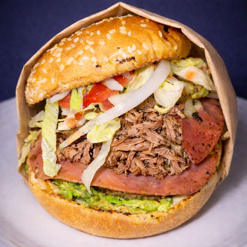 Carne de lomo, tocino, jamón, queso, aguacate y verduras