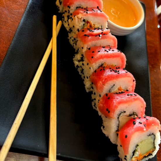 SUSHI NATURAL CON CUBIERTA DE ATÚN, RELLENO DE AGUCATE, PEPINO, PHILADELPHIA, ZANAHORIA Y ALGA, ESPOLVOREADO CON AJONJOLÍ, DIVIDIDO EN 10 BOCADOS, ACOMPAÑADO CON CHIPOTLE Y SOYA CITRICA.