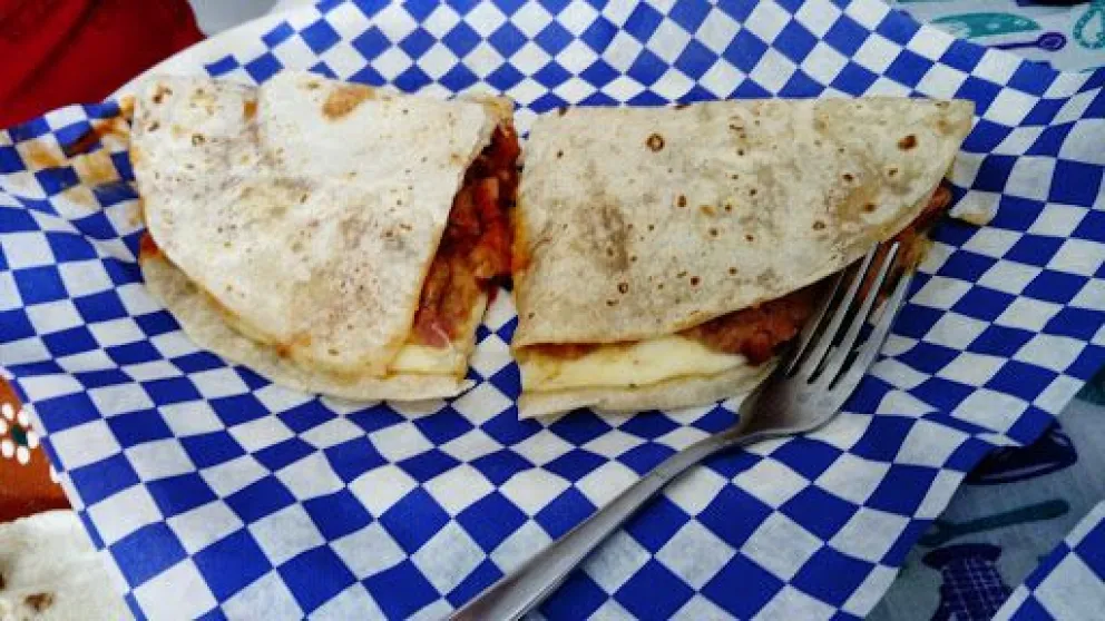 Deliciosa tortilla grande de harina casera con desbrada de la casa queso y verduras lechuga y cebolla