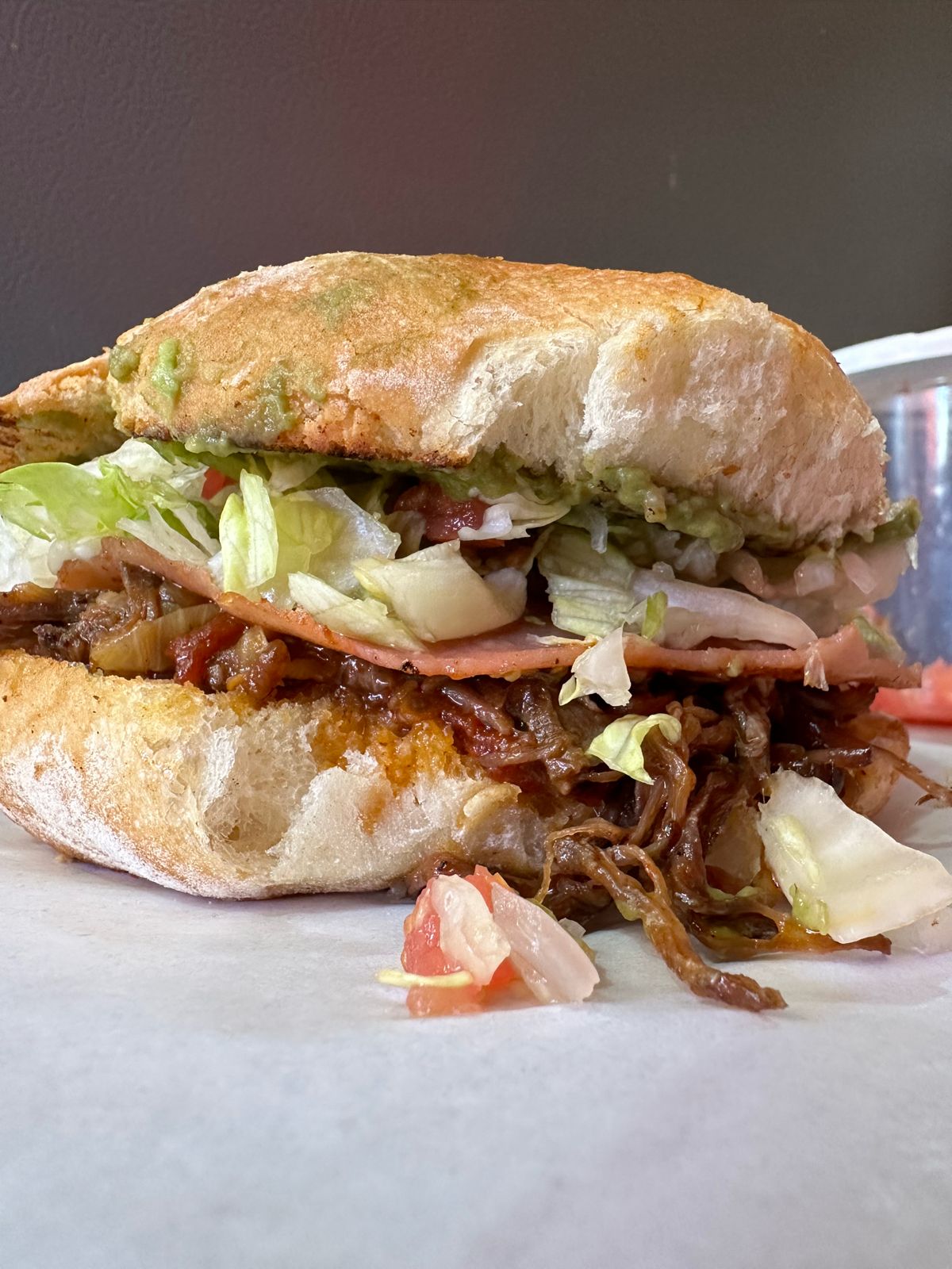 pan doradito, bistec con el queso derretido acompañado de lechuga y aguacate