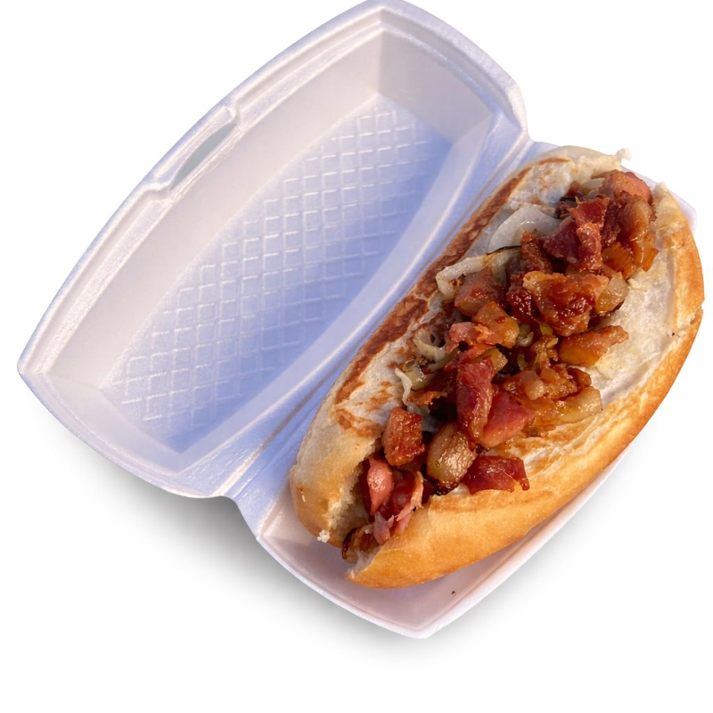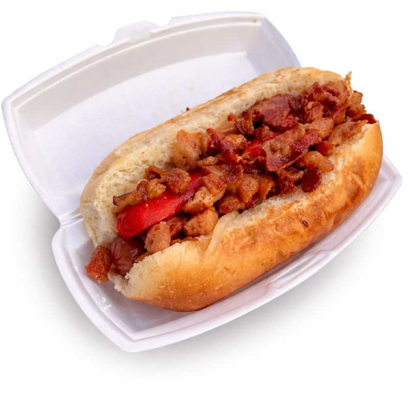 Pan artesanal, salchicha de pavo, cebolla asada y tocino