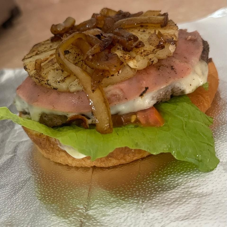 150 Gramos de carne de picaña, lechuga, tomate, piña, jamón y queso en delicioso pan brioche.