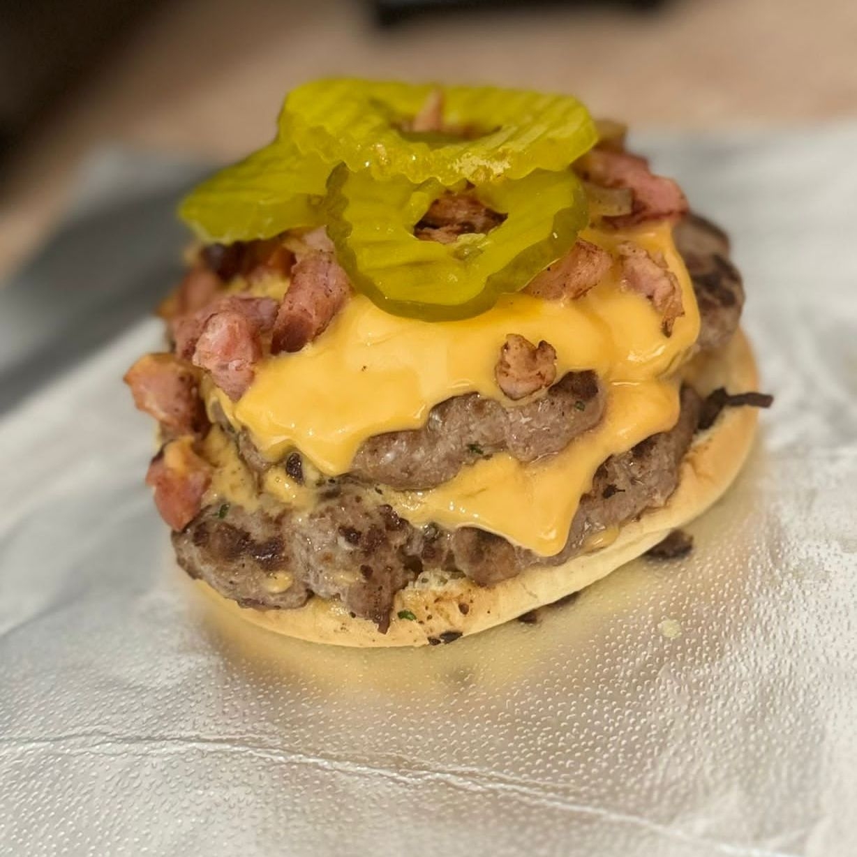 Doble carne de 150 g de picaña, doble tocino, doble queso amarillo, pepinillos y cebolla caramelizada en delicioso pan brioche.