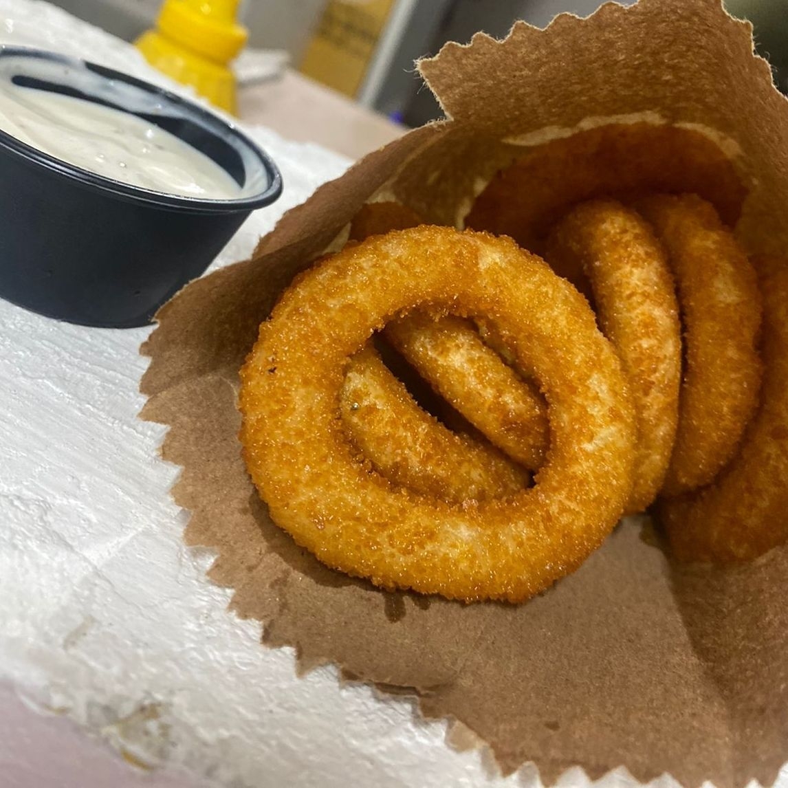 150 gr de carne de picaña, queso amarillo, tocino, aros de cebolla en delicioso pan brioche con aderezo de la casa