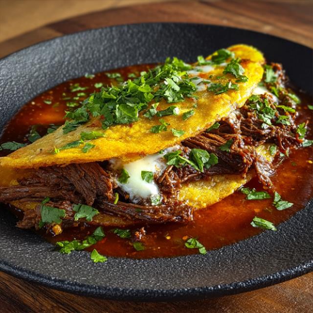 Doble tortilla de maíz, queso laurel y carne de sirloin al carbón o carne a elegir.