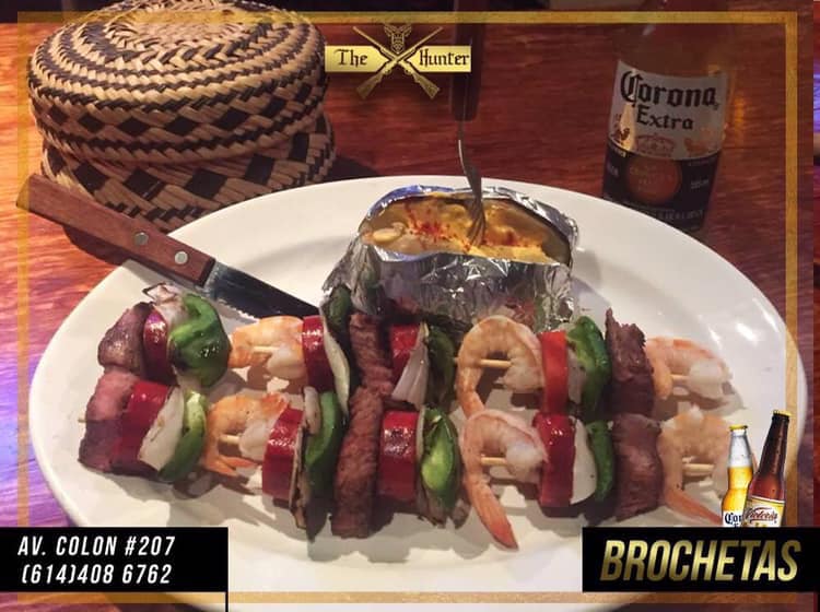 Carne, camarón, cebolla, salchicha campestre pimientos, acompañados de papa a la mantequilla