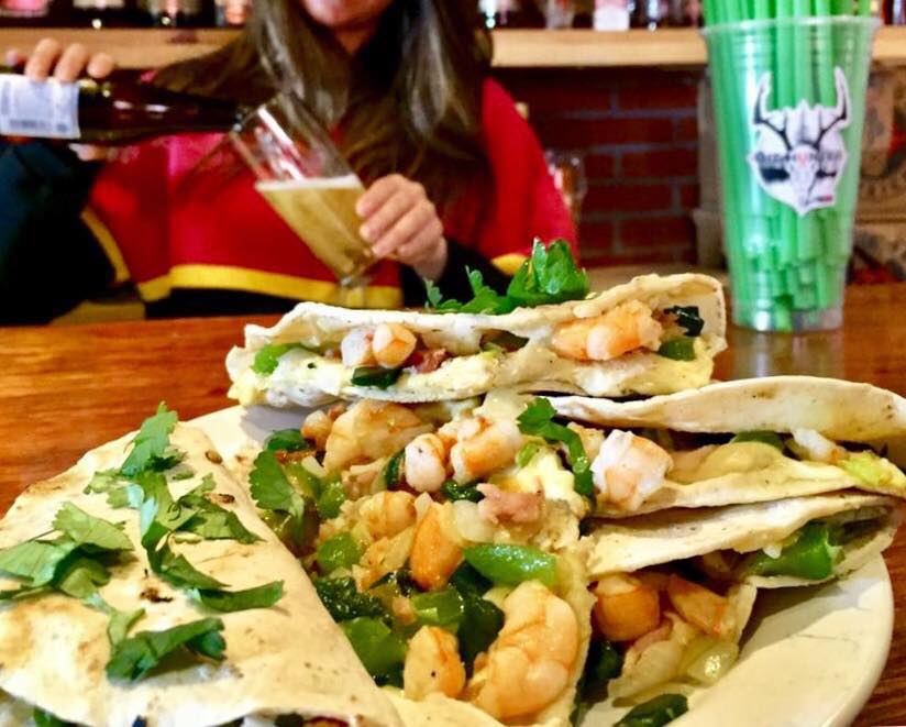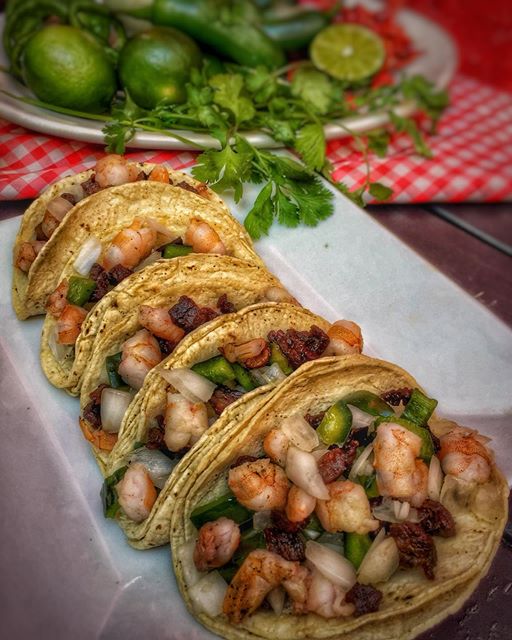 3 Tacos con camarón, cebolla, mix de chiles y queso gratinado, en tortilla grande.