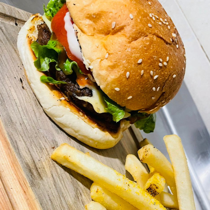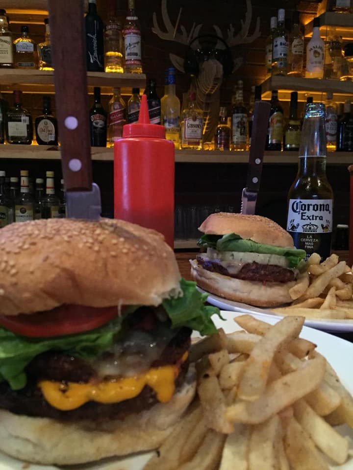 Carne 1/4 de libra, queso cheddar, cebolla caramelizada, champiñones, aderezos, lechuga y tomate.