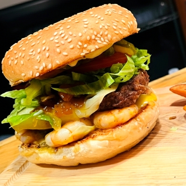 Carne 1/4 de libra, camarones a la plancha, tocino, queso chédar, cebolla caramelizada en BBQ, aderezos, lechuga y tomate