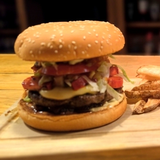 Carne 1/4 de libra, queso chédar, cebolla caramelizada en BBQ, tocino, aderezos, pepinillos, lechuga y tomate
