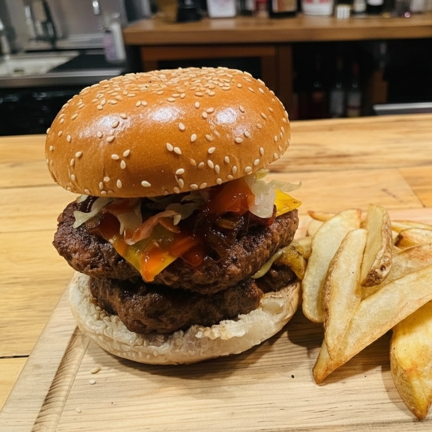 Doble carne, queso chédar, queso amarillo, cebolla caramelizada,lechuga , aderezos, pepinillos, lechuga y tomate