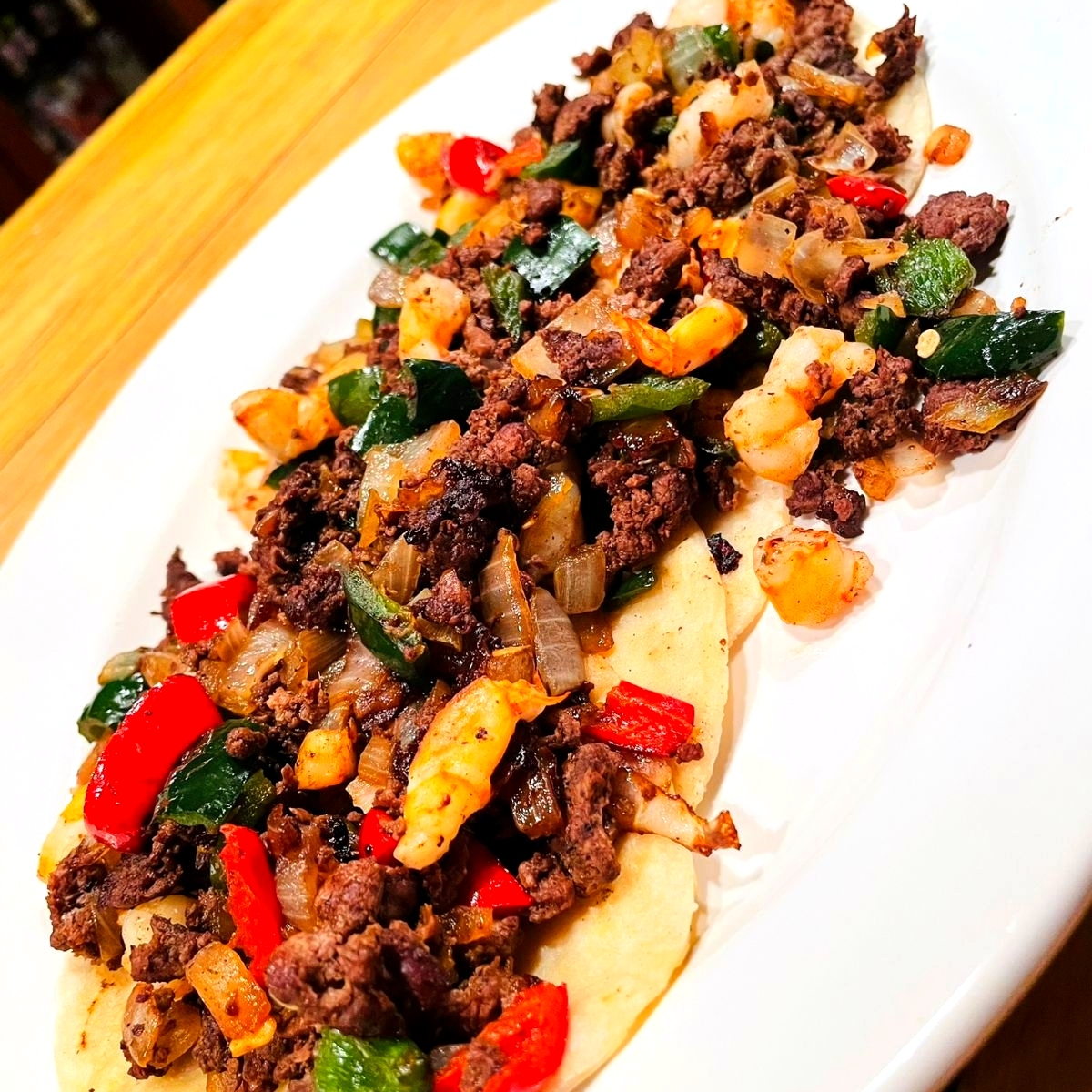 5 Piezas. Carne, camarones, mix de chiles y cebolla.
