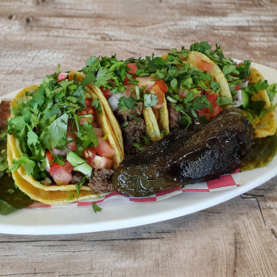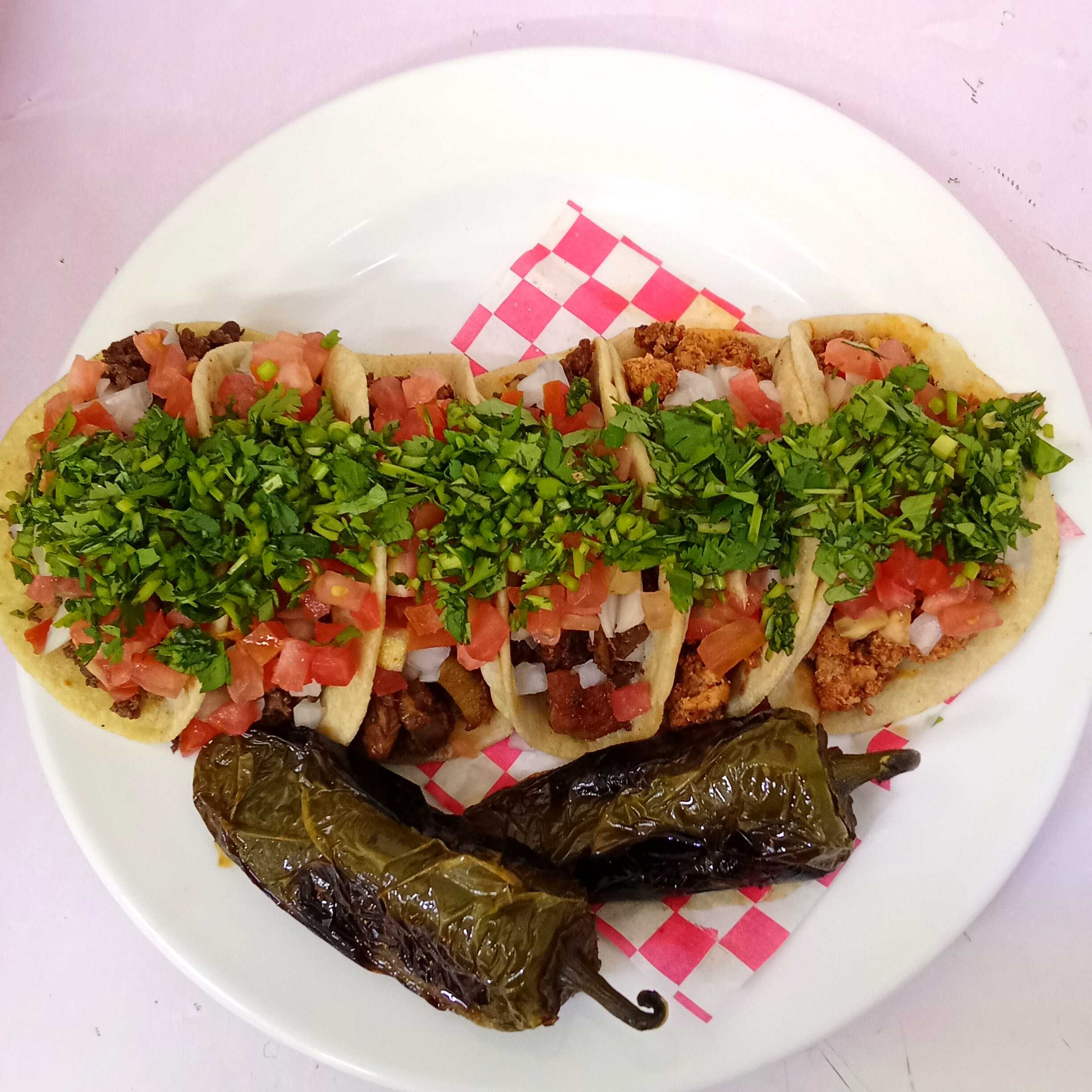 6 tacos de maiz con las 3 carnes, 2 bistec, 2 adobada y 2 de tripitas. acompañados de cebolla tomate y cilantro