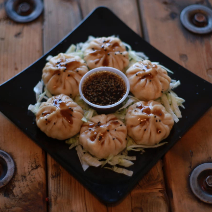 Dumplings acompañados de lechuga, zanahoria, salsa teriyaki y salsa macha