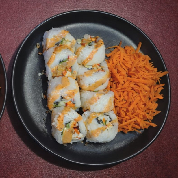 8 piezas de sushi acompañados con zanahoria, salsa teriyaki y salsa chipotle