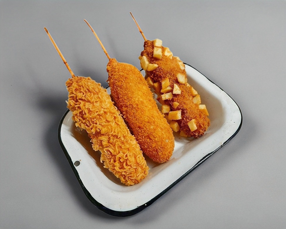Banderillas coreanas con salchicha premium empanizada con masa espacial y pan molido asiatico