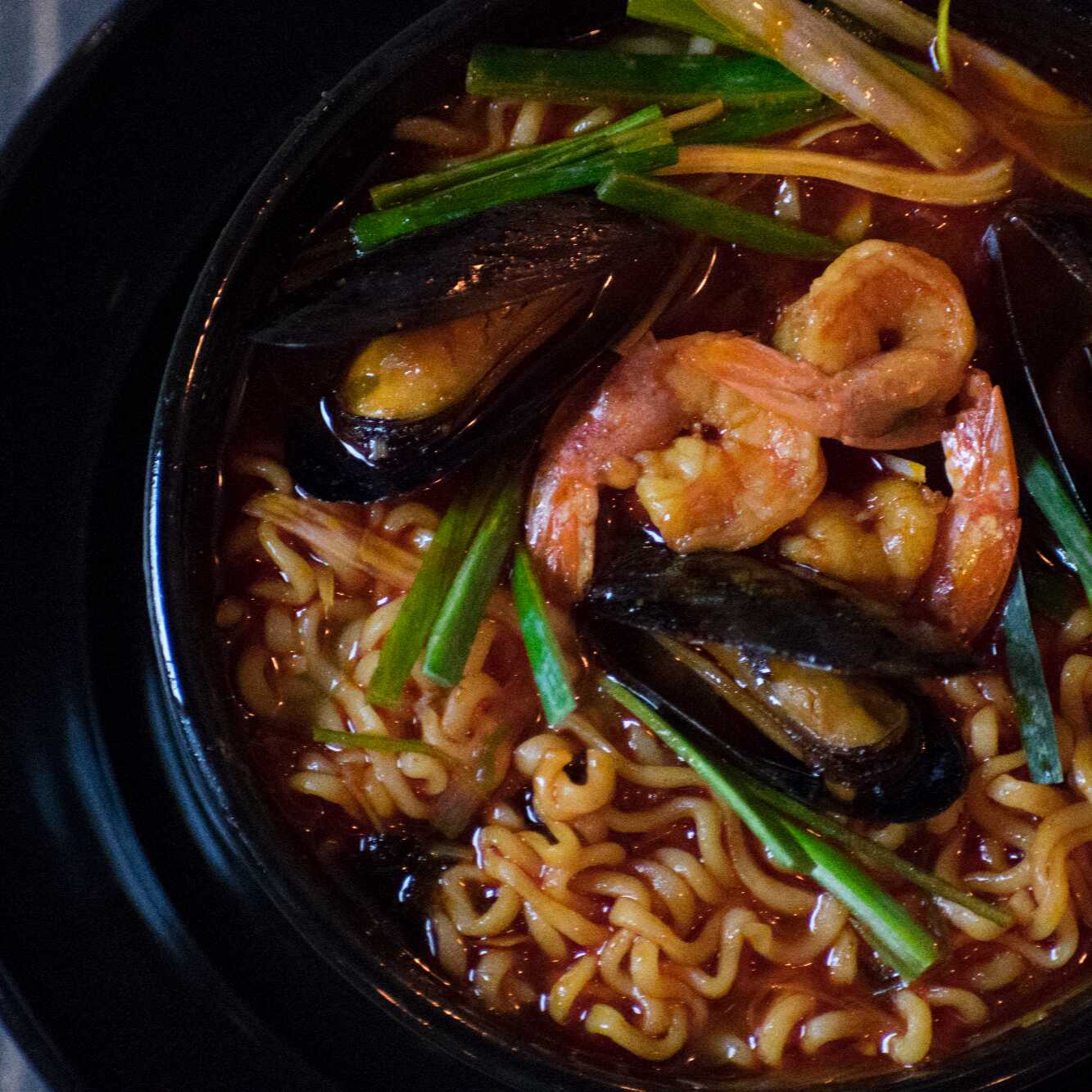 Fideos con camarón, aros de calamar, mejillón, almeja, poro, germinado de soya, cebollín, chile de arbol