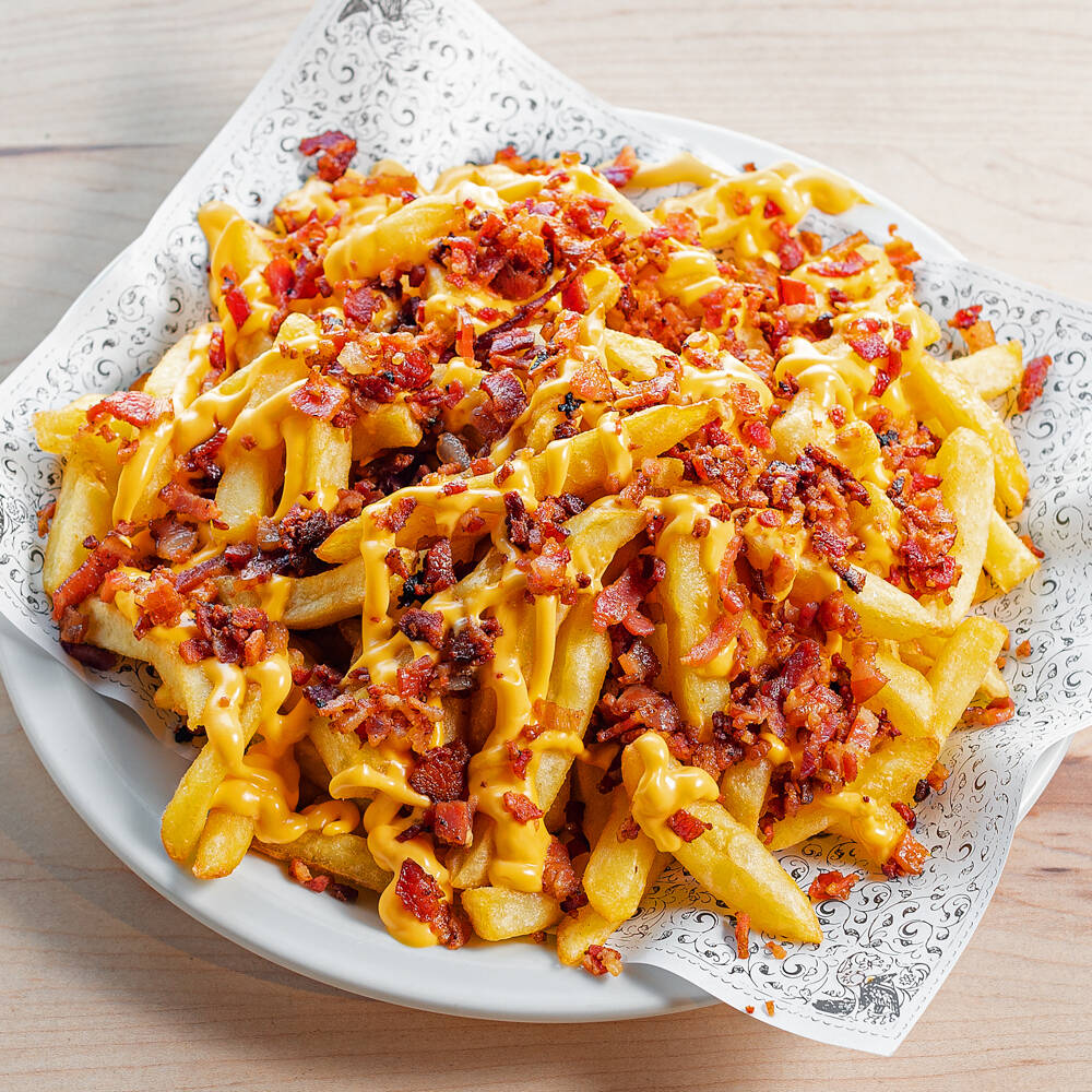 Carne, queso cheddar, jalapeño rojo, Siriracha, pepinilloa y cebolla frita