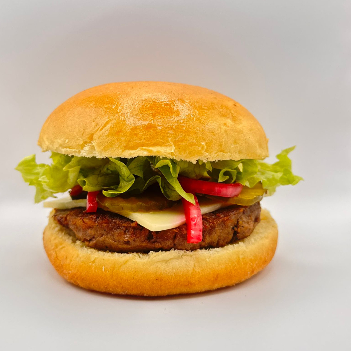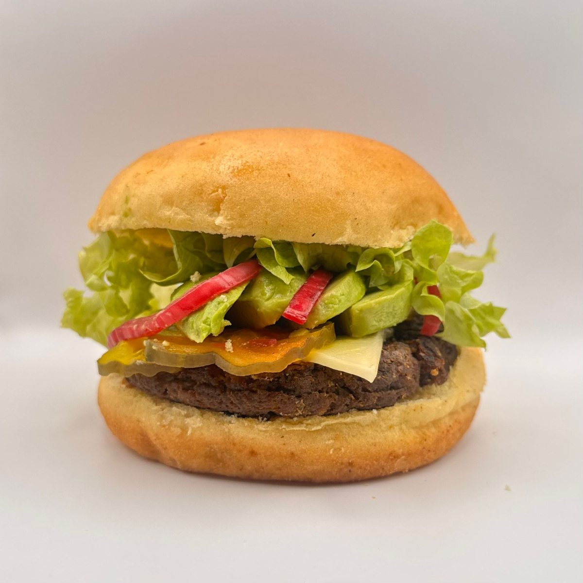 patty con base de seitan, frijol negro champiñones , queso vegano ,y especias