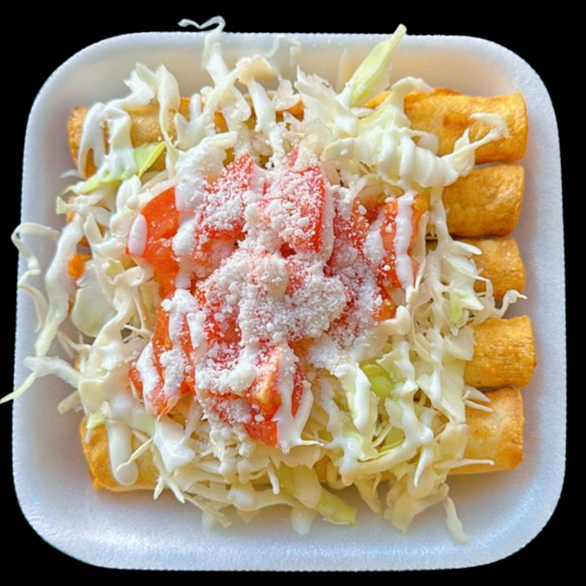 5 Deliciosas flautas doraditas acompañadas de repollo, tomate, queso y crema.