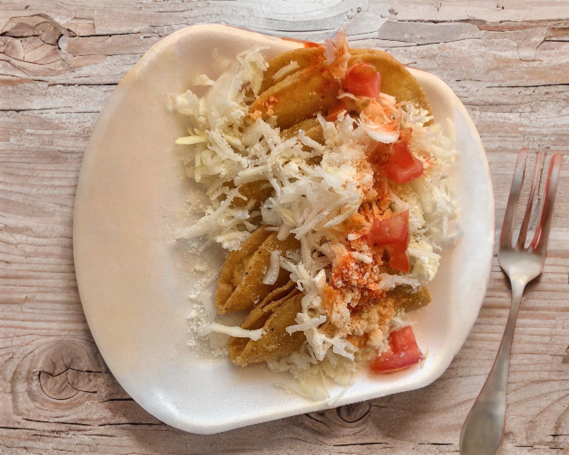Flautas de Pollo doraditas servidas con repollo,tomate , queso y salsas aparte