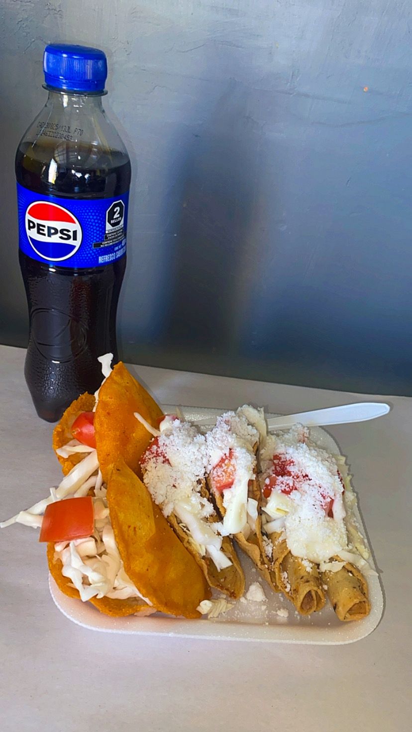 dos Gorditas De Papa, dos tacos dorados y dos flautas con refresco de 400 ml