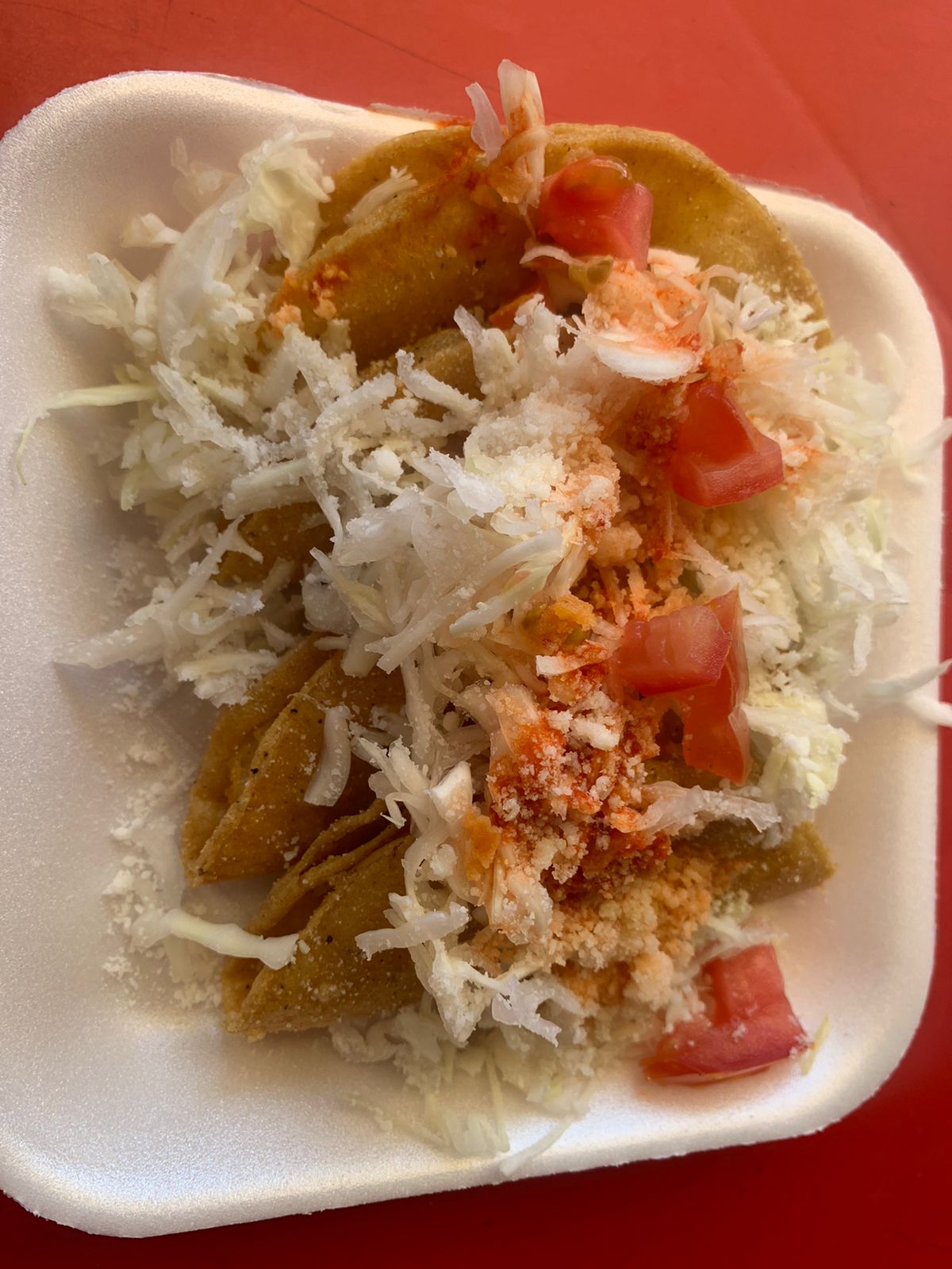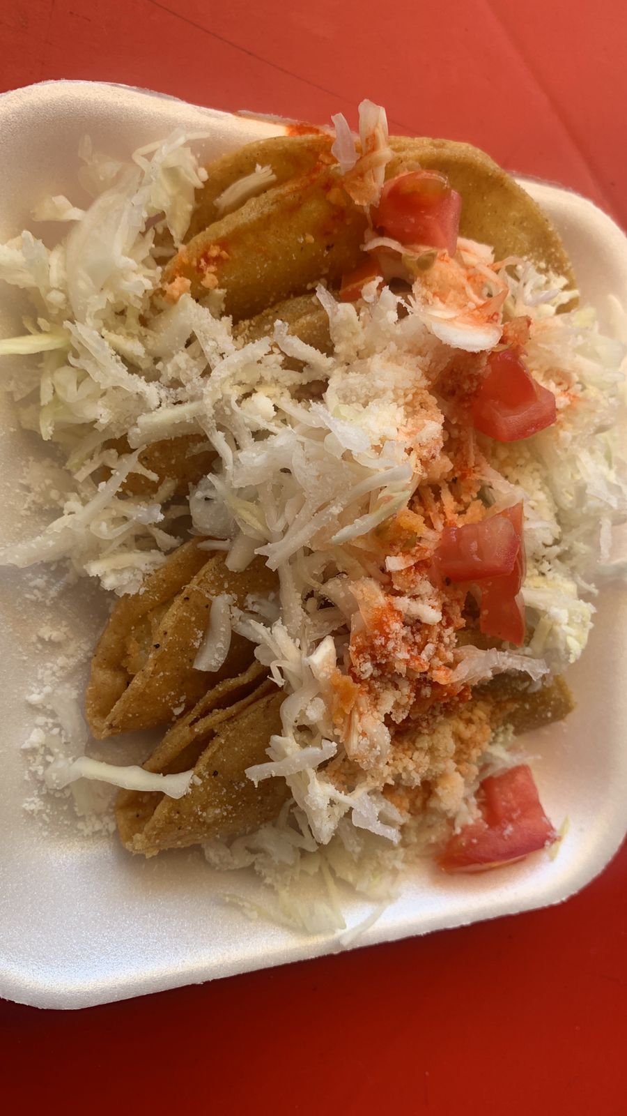 3 tacos doraditos de papa con tomate, repollo y queso
