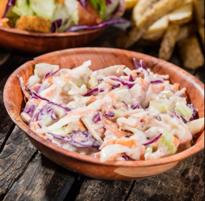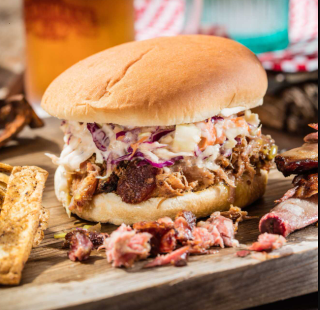 Pulled pork bañado en honey mustard y ensalada de col, acompañado de papas.