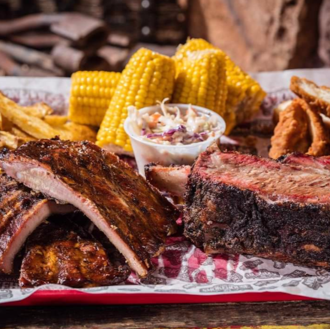 Lo mejor de nuestro menú. Recomendado para 3 o 4 personas, medio rack de puerco, medio plate rib, papas, elotes, tender de pollo y ensalada de col.