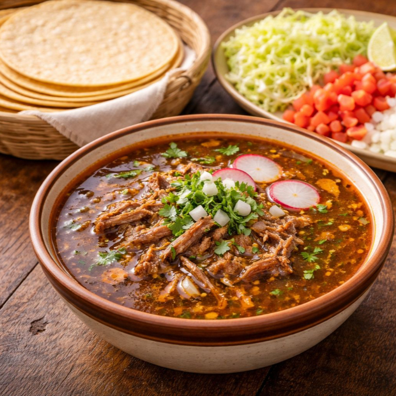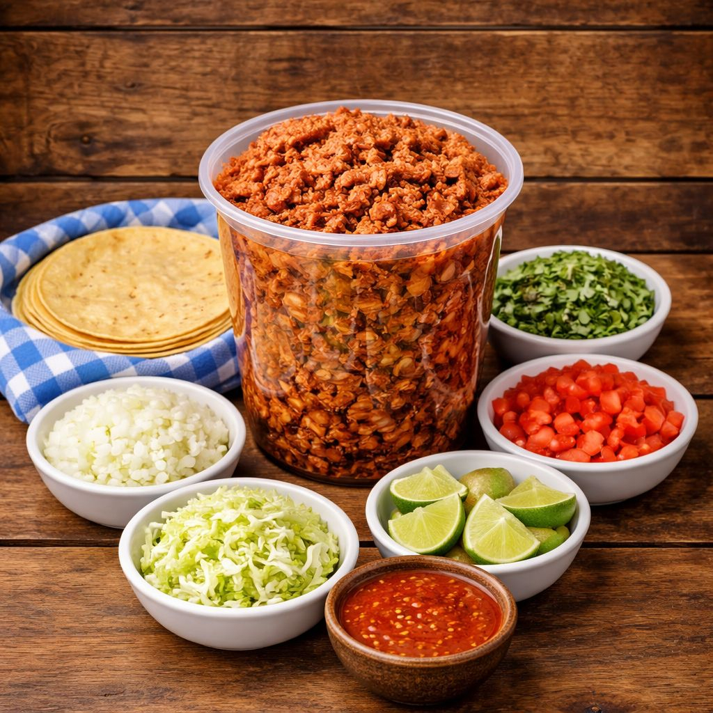 Acompañado de tortillas, repollo, cebolla, tomate, cilantro, limones y salsa.