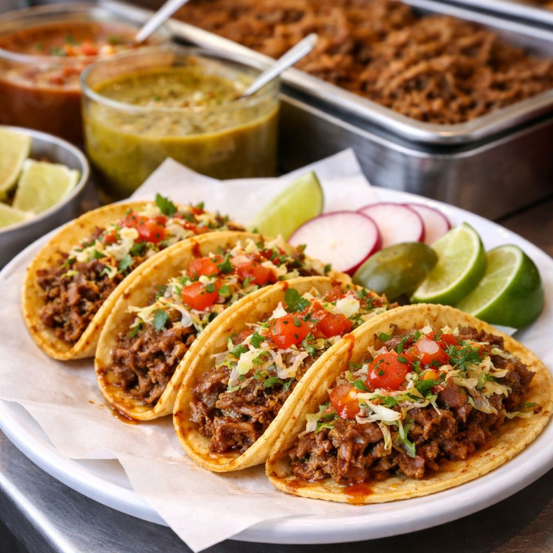 4 tacos de tortilla de maíz acompañado de repollo, cebolla, tomate, cilantro, limón y salsa.
