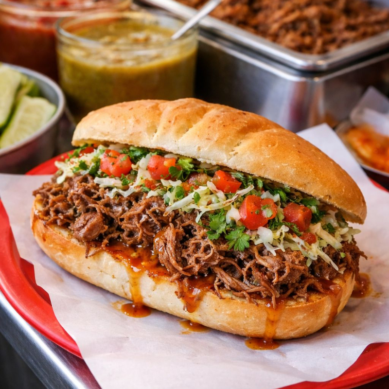 Acompañado de repollo, cebolla, tomate, cilantro, limón y salsa.