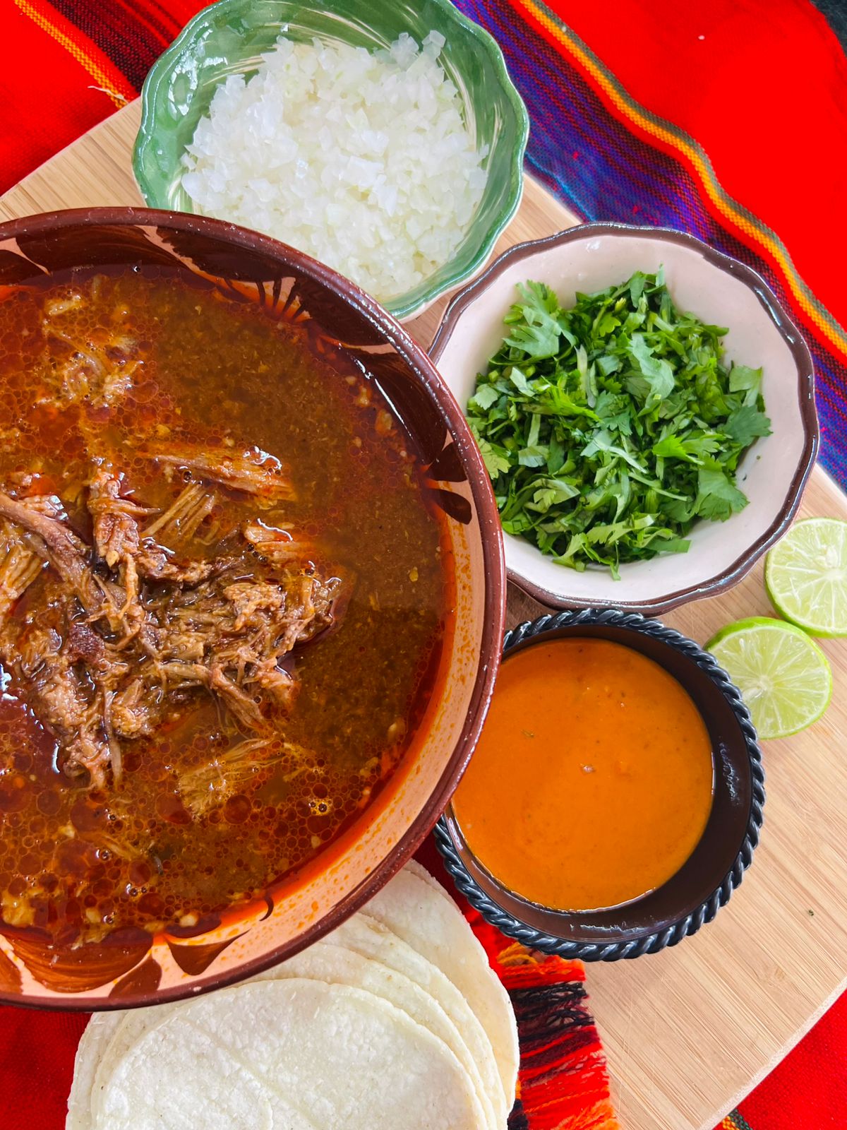 Consomé con carne de Birria estilo Sinaloa, incluye verdura (repollo, cilantro, cebolla, limón) tortillas y salsa roja