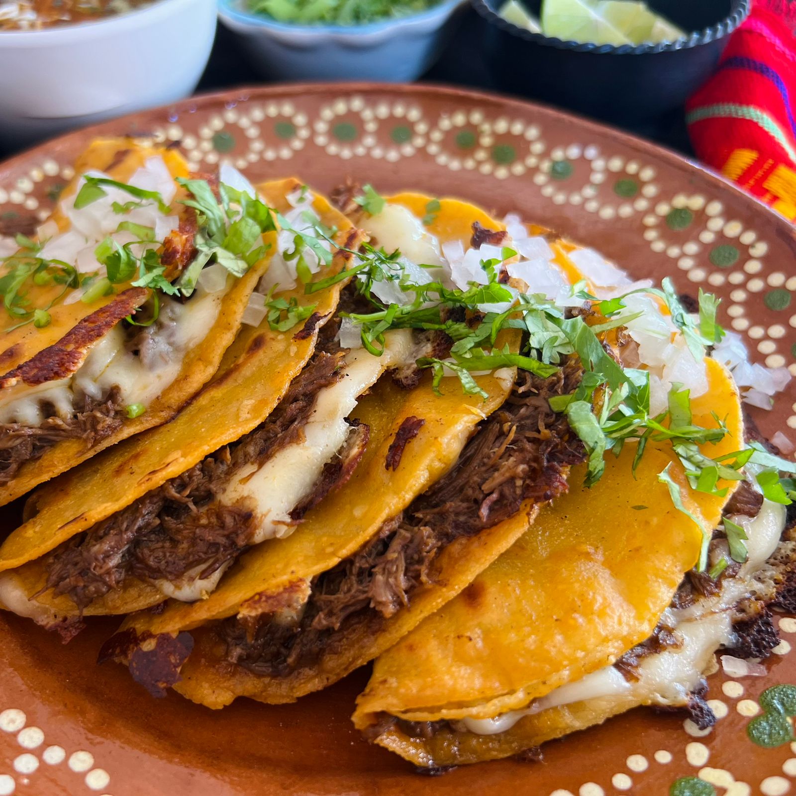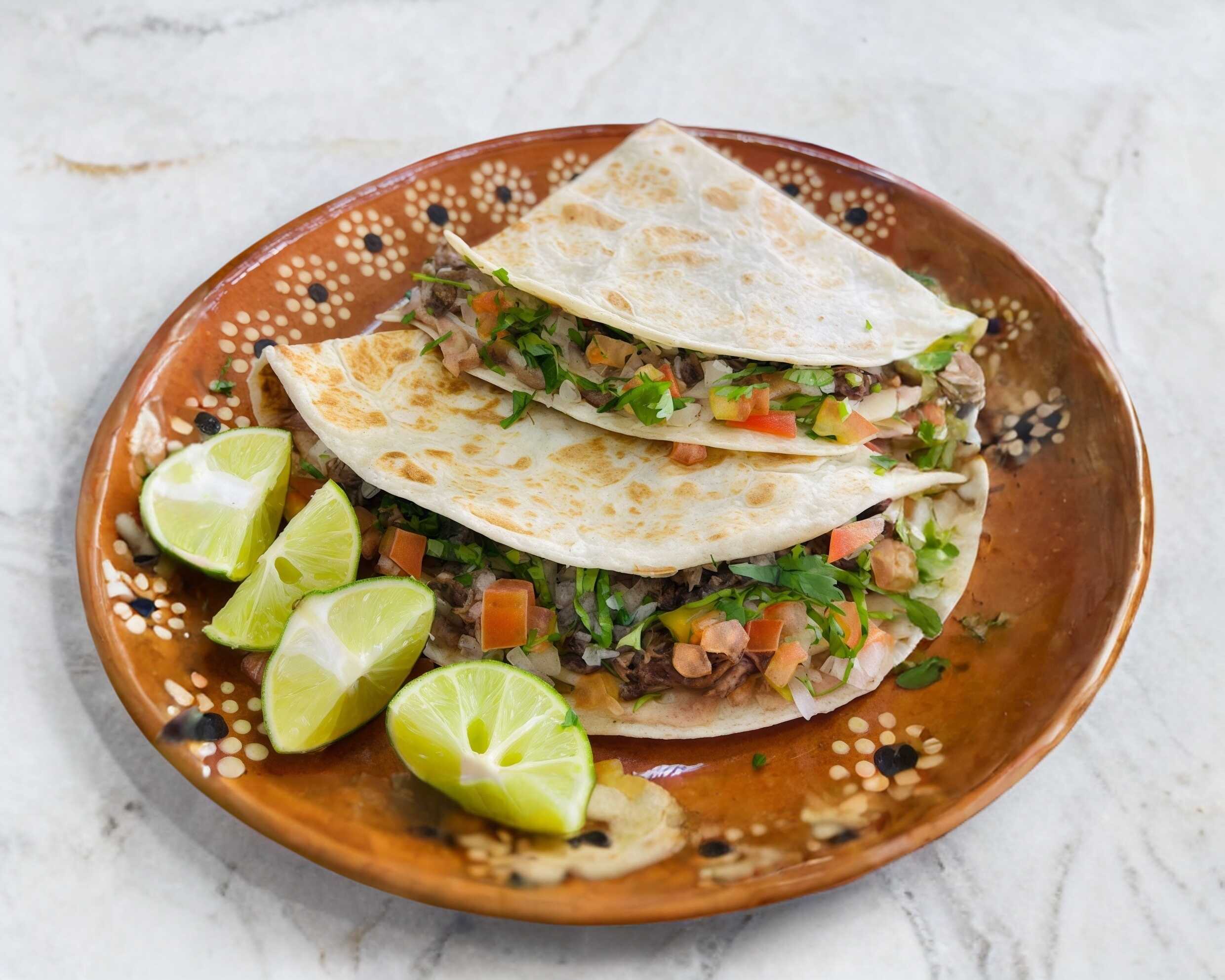 4 quesadillas de maiz doradas, queso y carne de birria, incluye verdura (repollo, cilantro, cebolla blanca, cebolla curtida, limón) y salsas