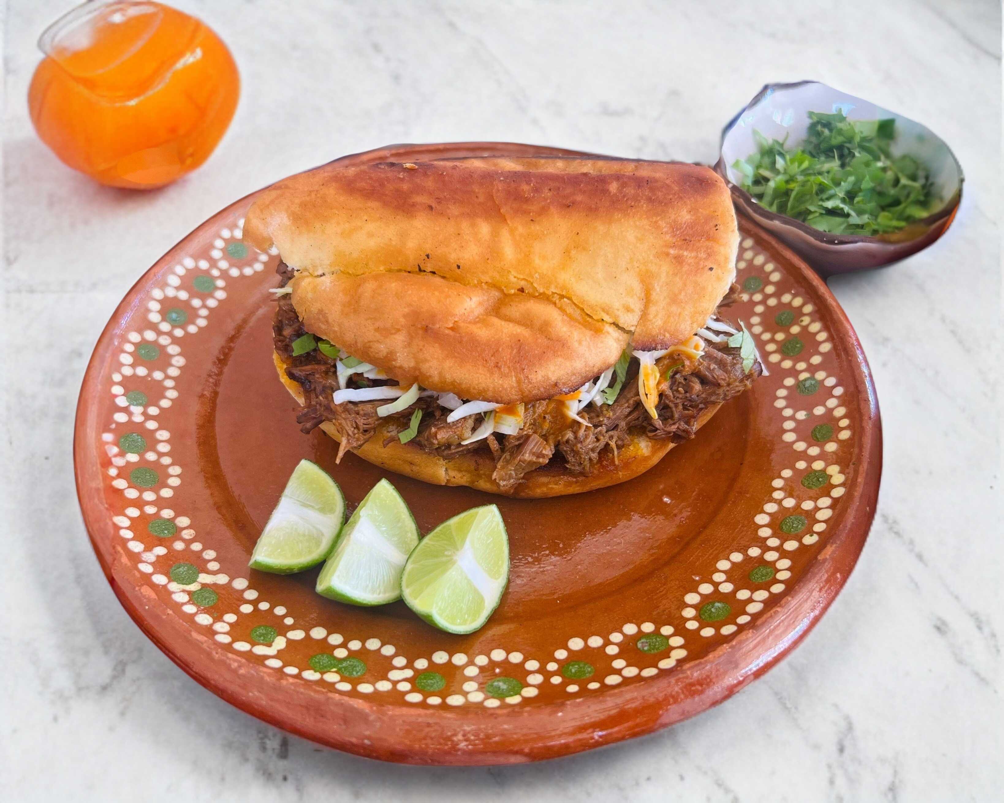 Pan blanco semidorado con birria, incluye 1 caldo de birria de 6oz, verdura y salsas