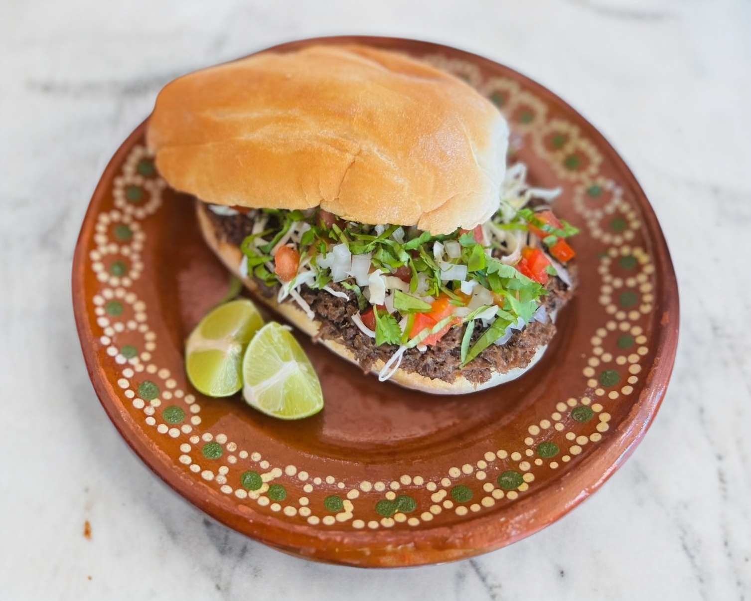 Pan de blanco con barbacoa de res. Incluye la verdura aparte (repollo, cilantro, cebolla, tomate y limones) salsa roja y verde