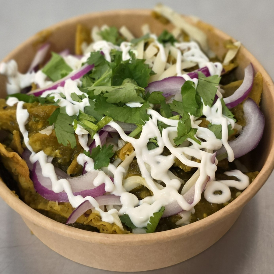 Crujientes totopos de maíz bañados en nuestra salsa verde.