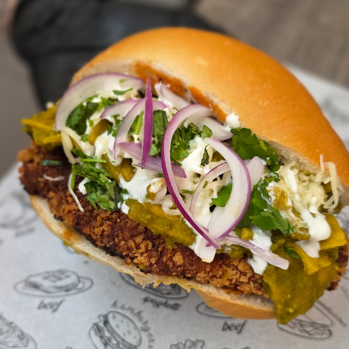 Delicioso bolillo relleno de frijoles refritos, crujiente milanesa de pollo empanizada y chilaquiles con salsa Crema Chipotle