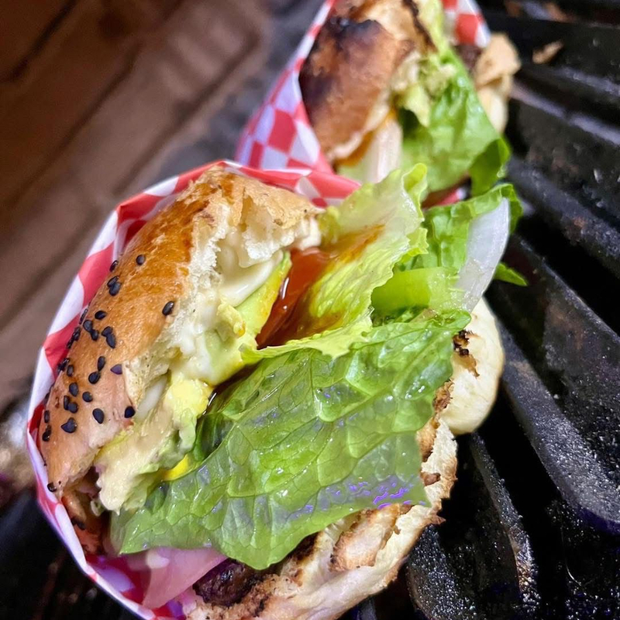 Pan, carne, salchicha, tocino, aguacate, verdura y aderezos.